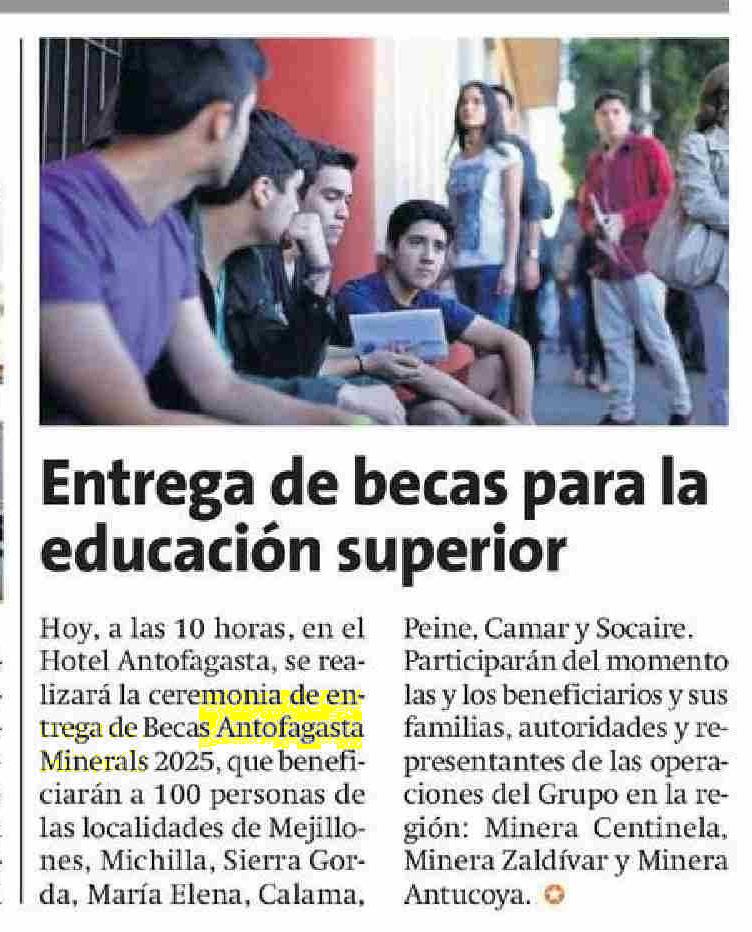 Título: Hoy, a las 10 horas, en el Hotel Antofagasta, se realizará la ceremonia de entrega de Becas Antofagasta Minerals 2025, que beneficiarán a 100 personas de las localidades de Mejillones, Michilla, Sierra Gorda, María Elena, Calama,