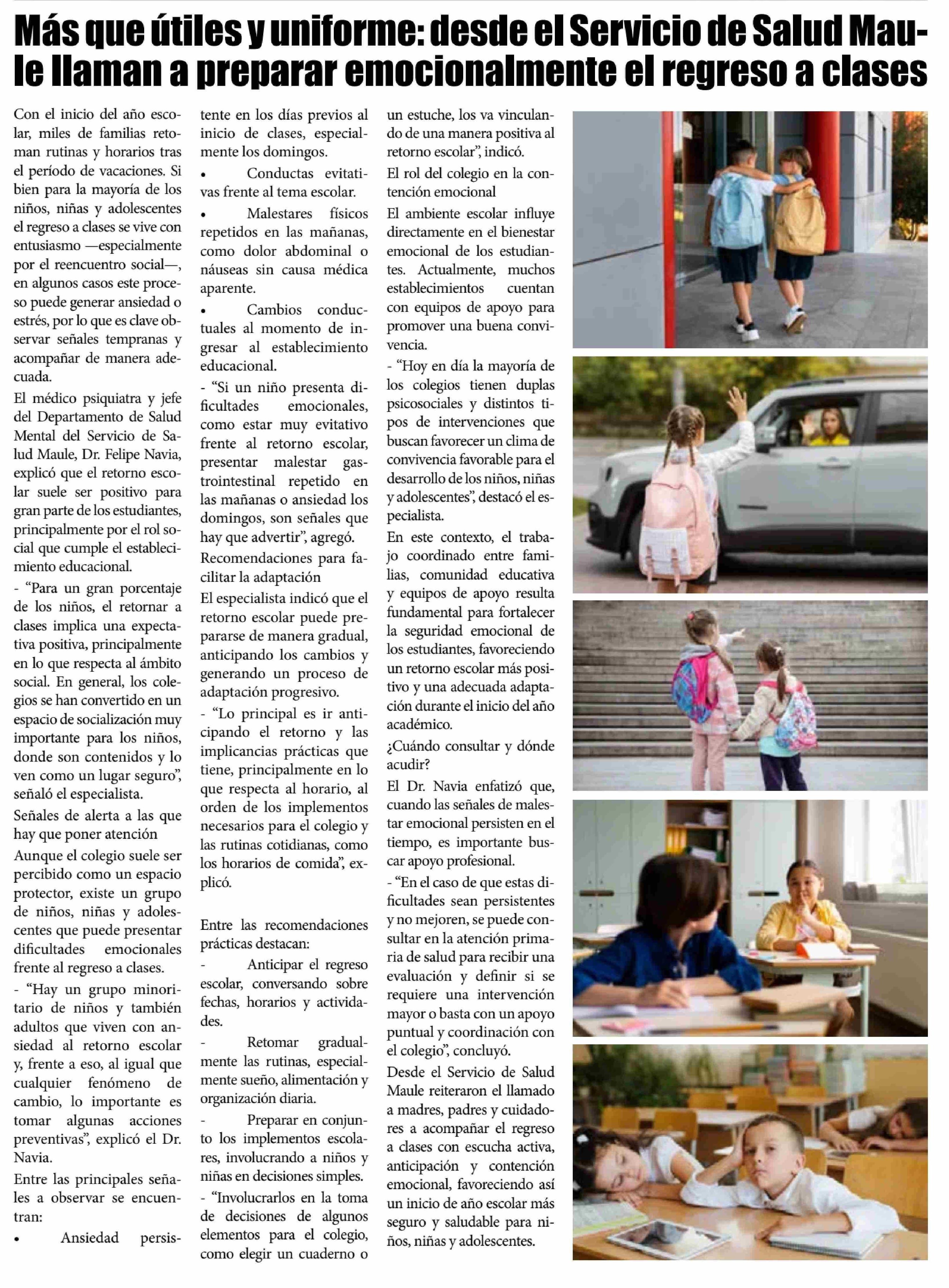 Título: Más que útiles y uniforme: desde el Servicio de Salud Maule llaman a preparar emocionalmente el regreso a clases
