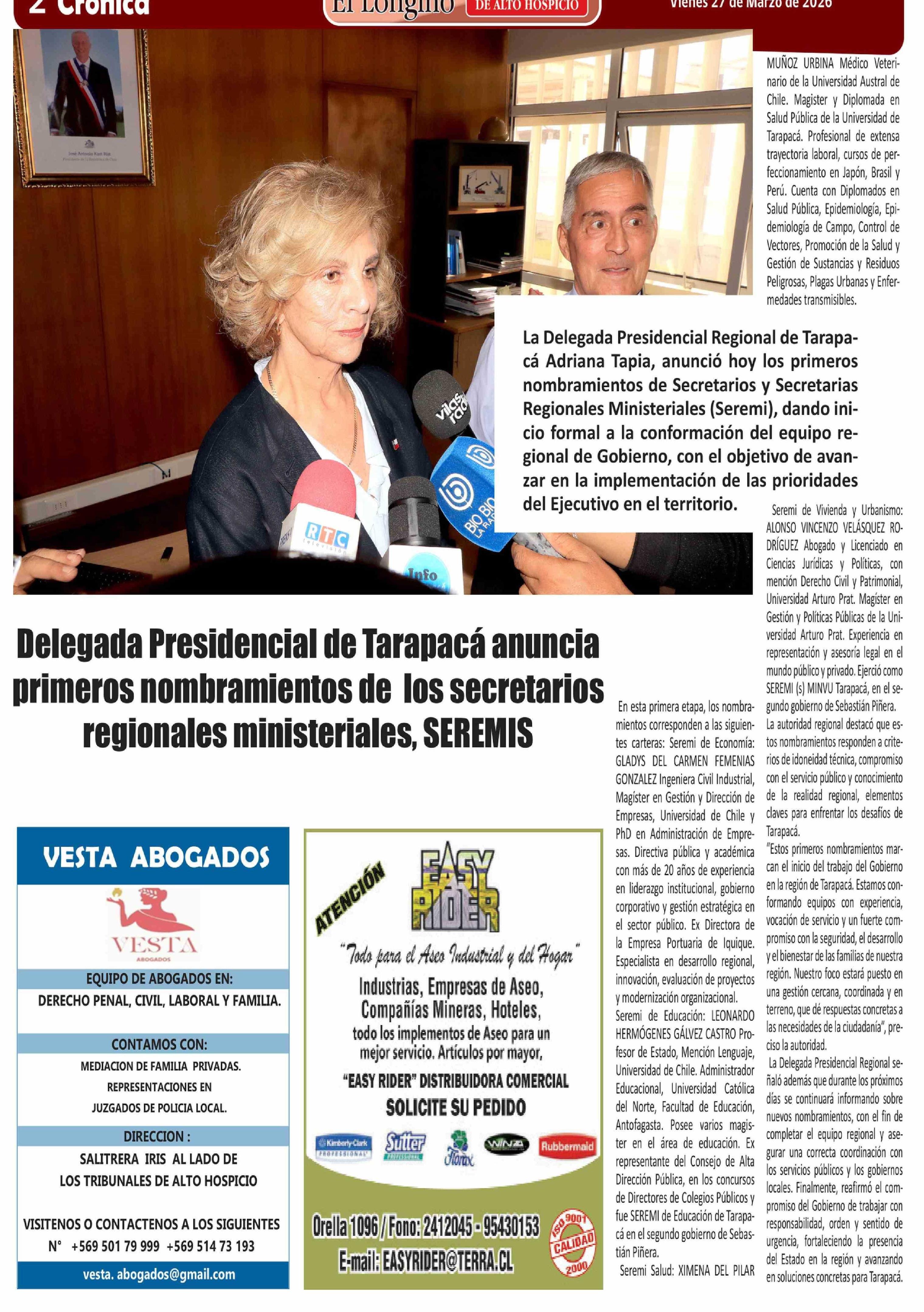 Delegada Presidencial de Tarapacá anuncia primeros nombramientos de los secretarios regionales ministeriales, SEREMIS 27-03-2026 El Longino |