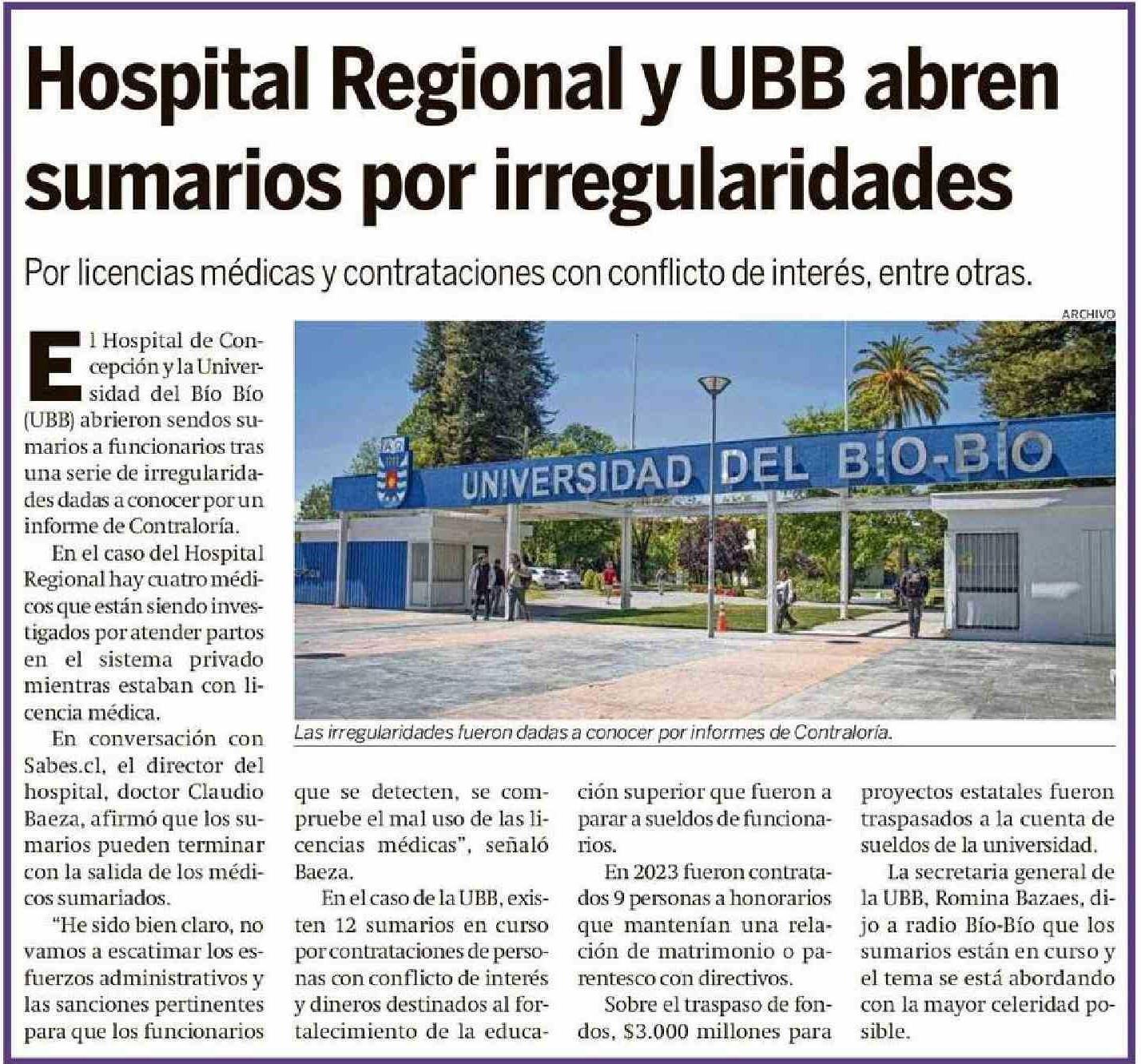 | Título: | Hospital Regional y UBB abren sumarios por irregularidades |