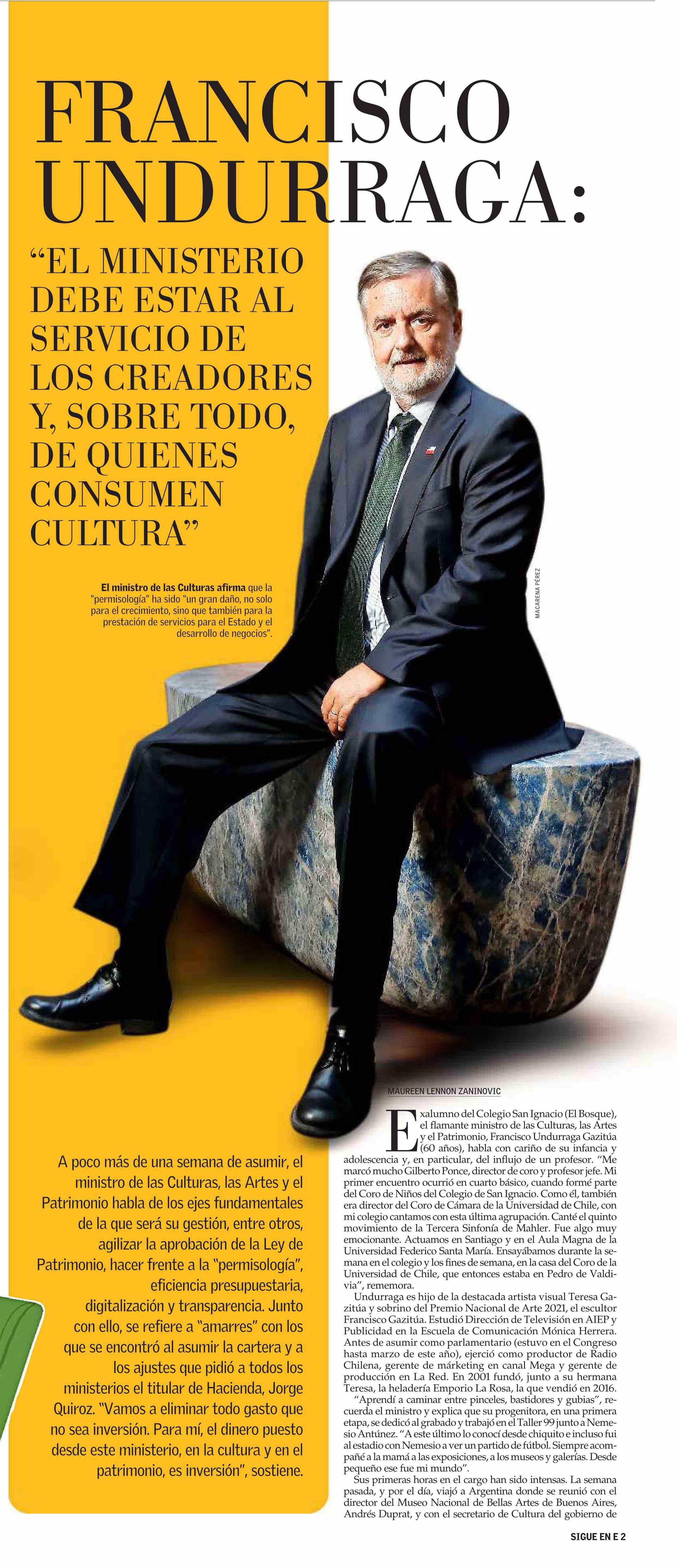 FRANCISCO UNDURRAGA: “EL MINISTERIO DEBE ESTAR AL SERVICIO DE LOS CREADORES Y, SOBRE TODO, DE QUIENES CONSUMEN CULTURA” 22-03-2026 El Mercurio |