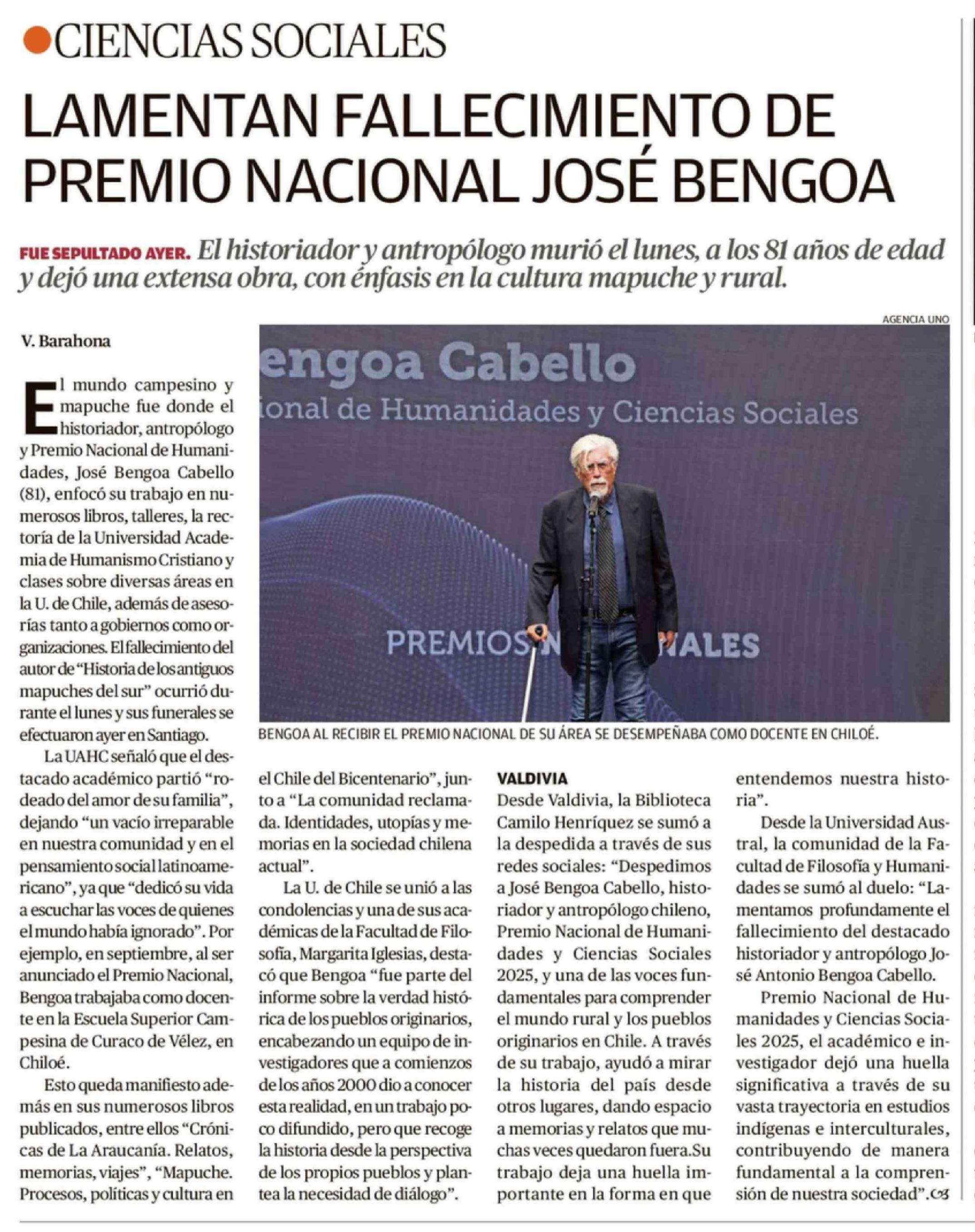 LAMENTAN FALLECIMIENTO DE PREMIO NACIONAL JOSÉ BENGOA 26-03-2026 Diario Austral Región de Los Ríos |
