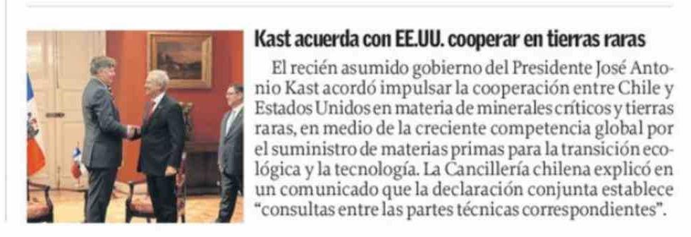 Título: Kast acuerda con EE.UU. cooperar en tierras raras
