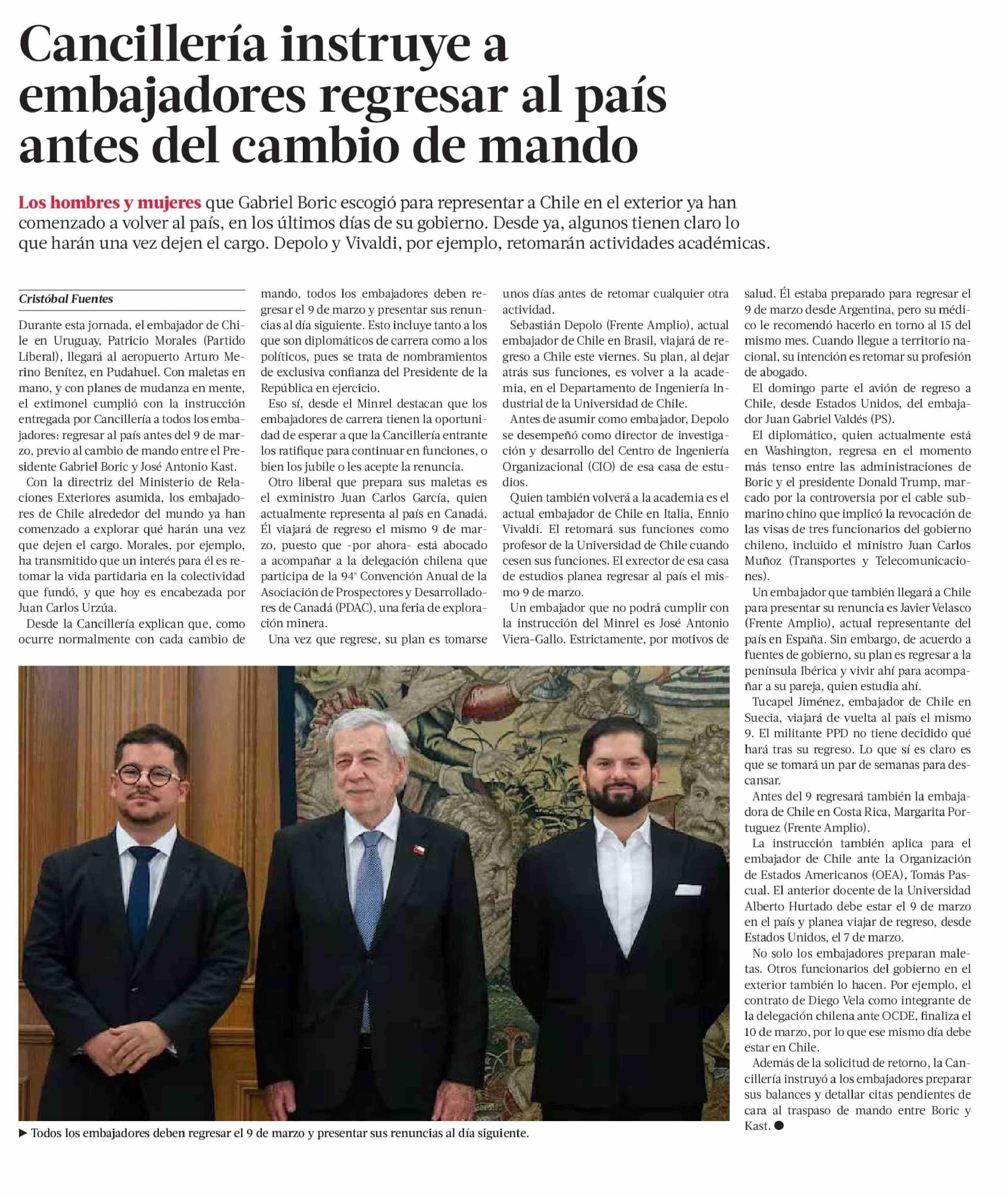 Cancillería instruye a embajadores regresar al país antes del cambio de mando 04-03-2026 La Tercera |