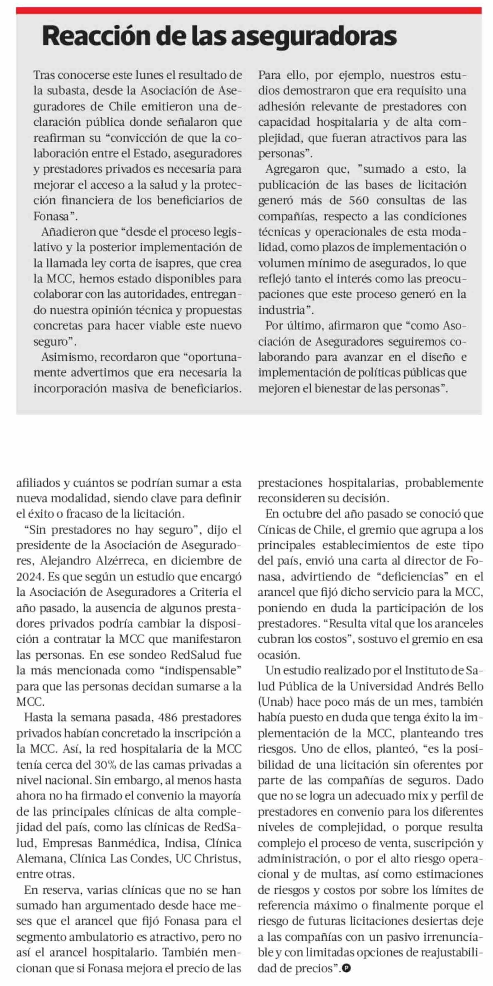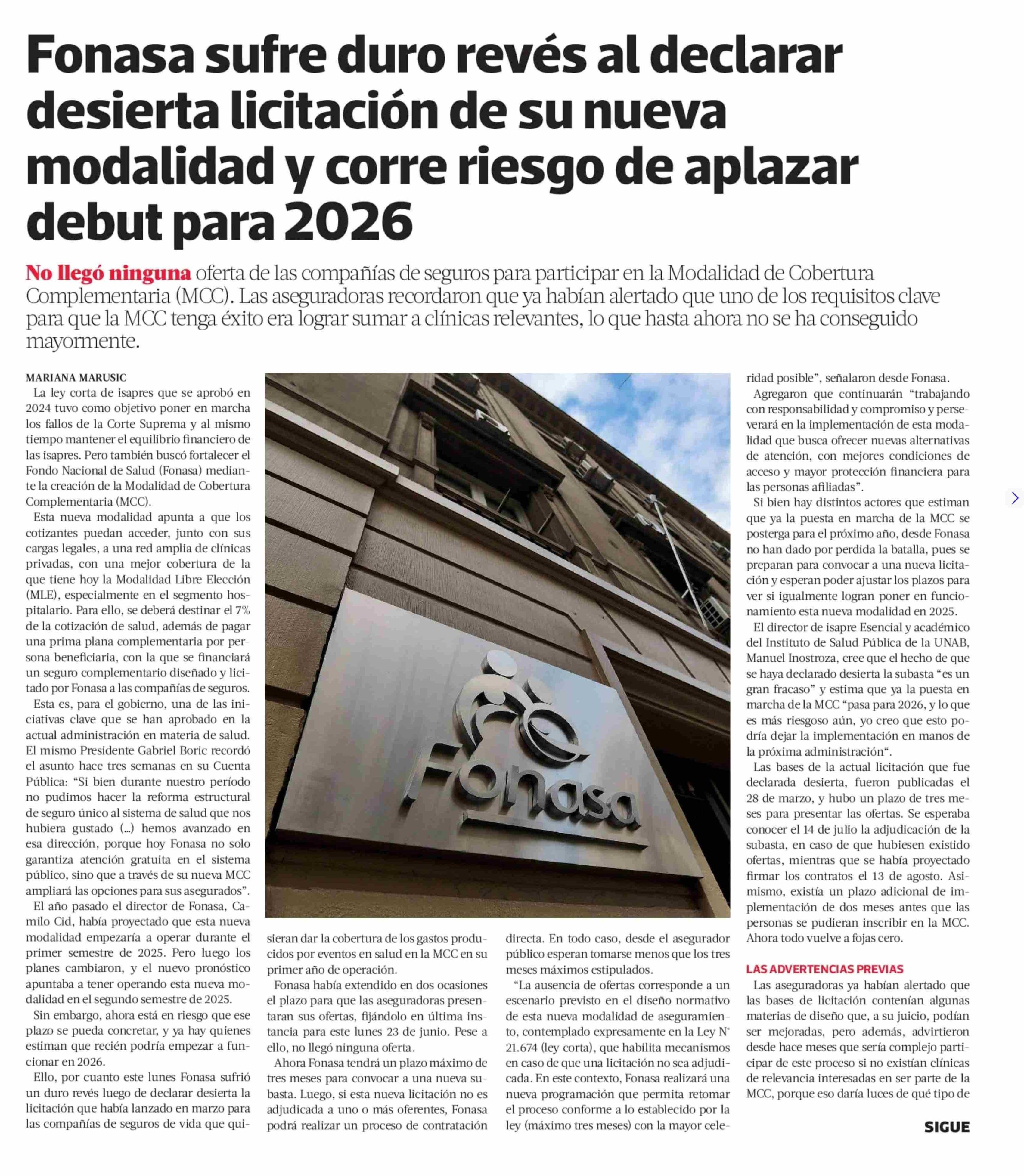 Fonasa sufre duro revés al declarar desierta licitación de su nueva modalidad y corre riesgo de aplazar debut para 2026 24-06-2025 La Tercera |