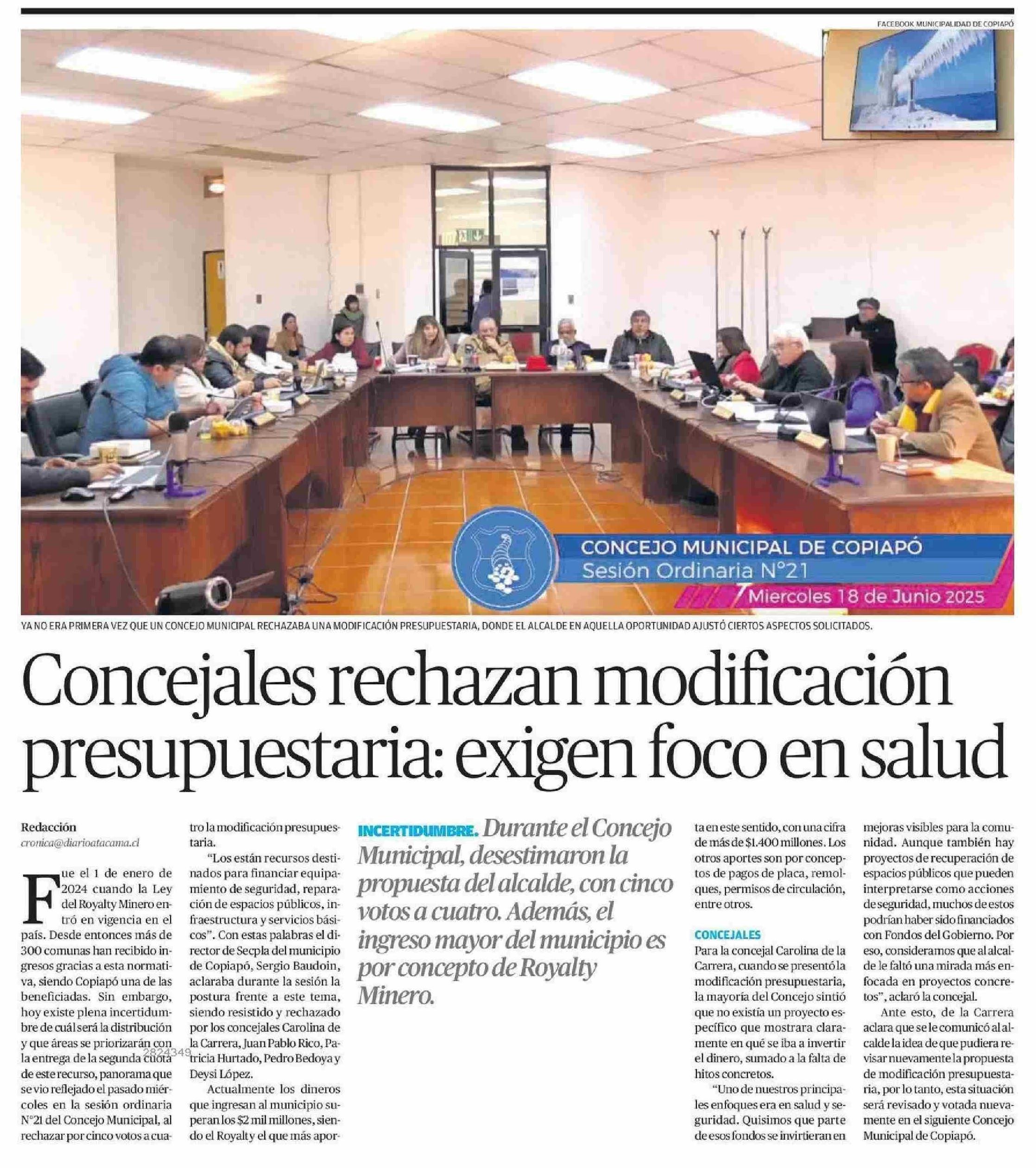 Concejales rechazan modificación presupuestaria: exigen foco en salud 20-06-2025 El Diario de Atacama |