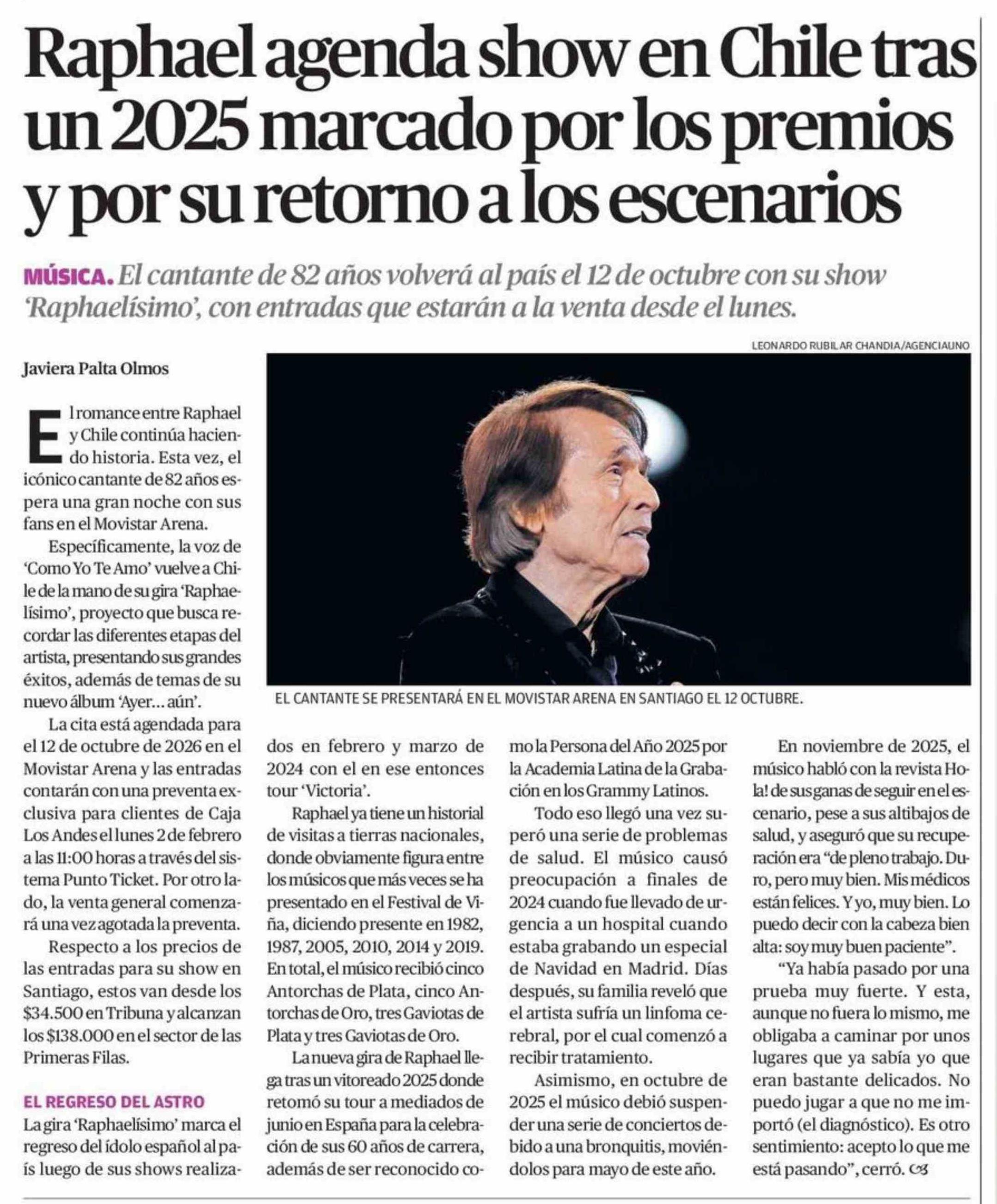 Título: Raphael agenda show en Chile tras un 2025 marcado por los premios y por su retorno a los escenarios