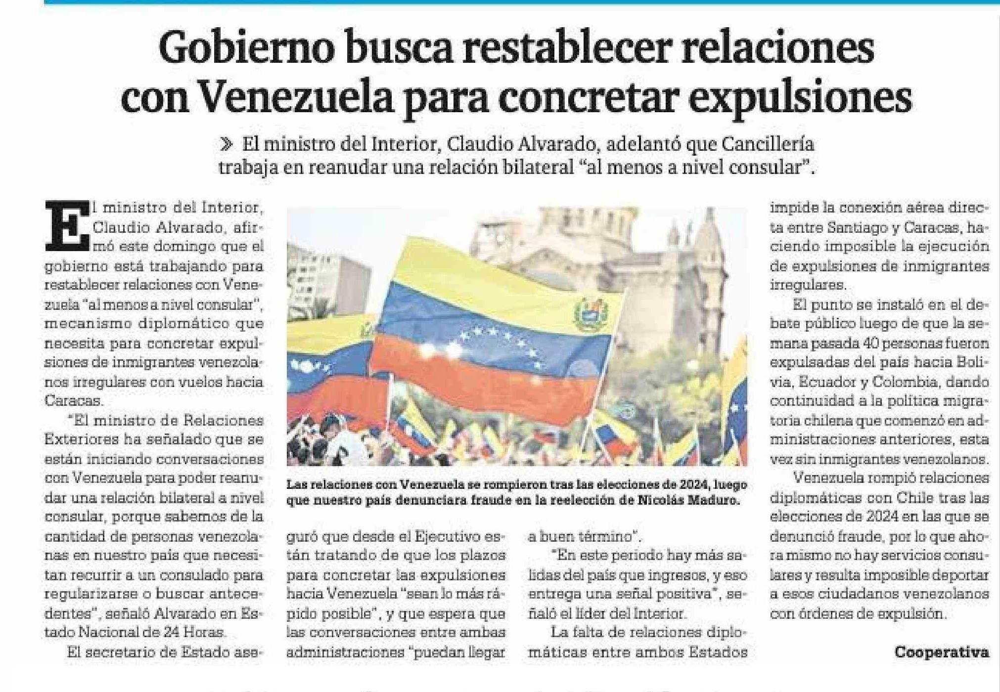 | Título: | Gobierno busca restablecer relaciones con Venezuela para concretar expulsiones |