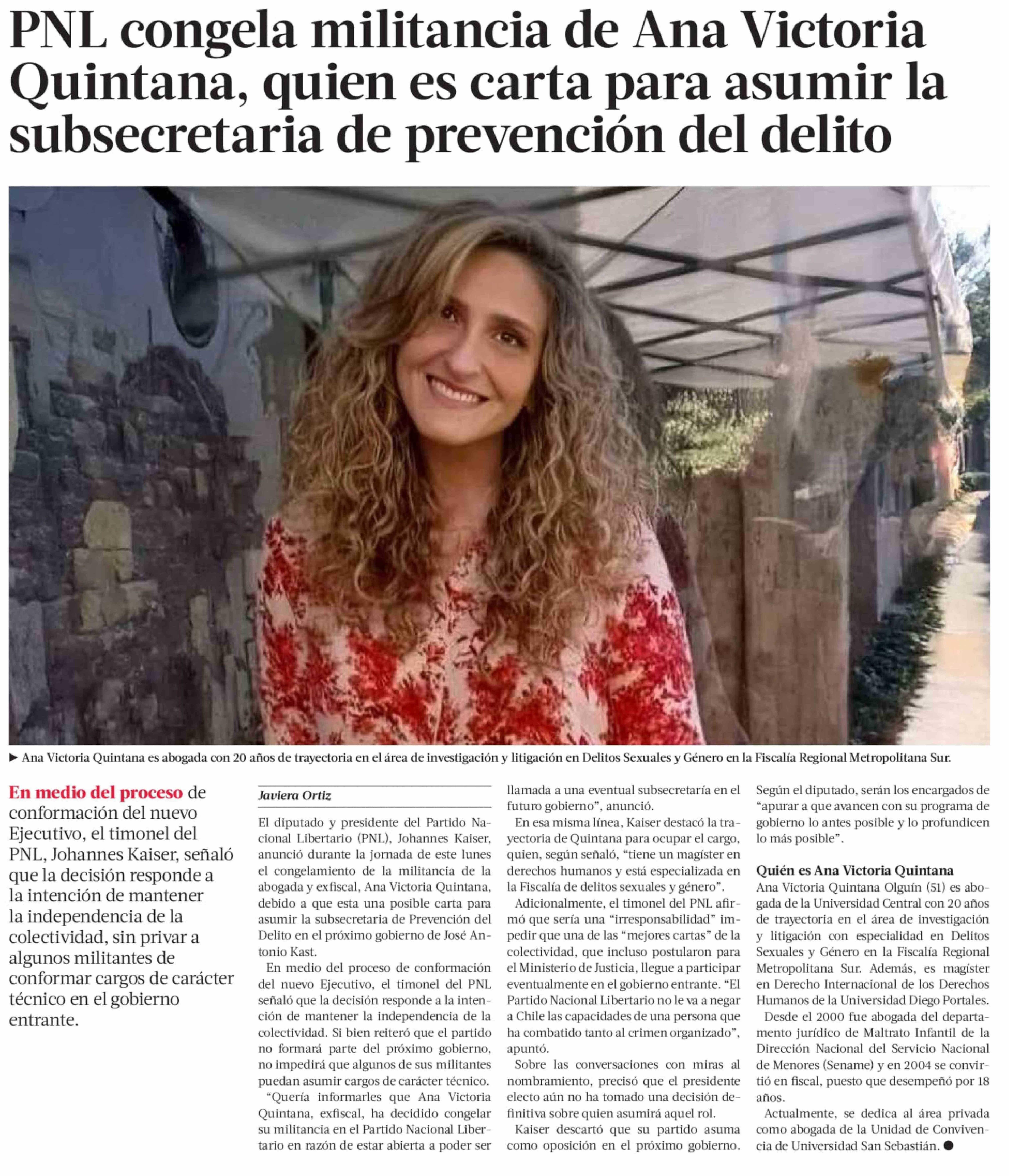 PNL congela militancia de Ana Victoria Quintana, quien es carta para asumir la subsecretaria de prevención del delito 03-02-2026 La Tercera |