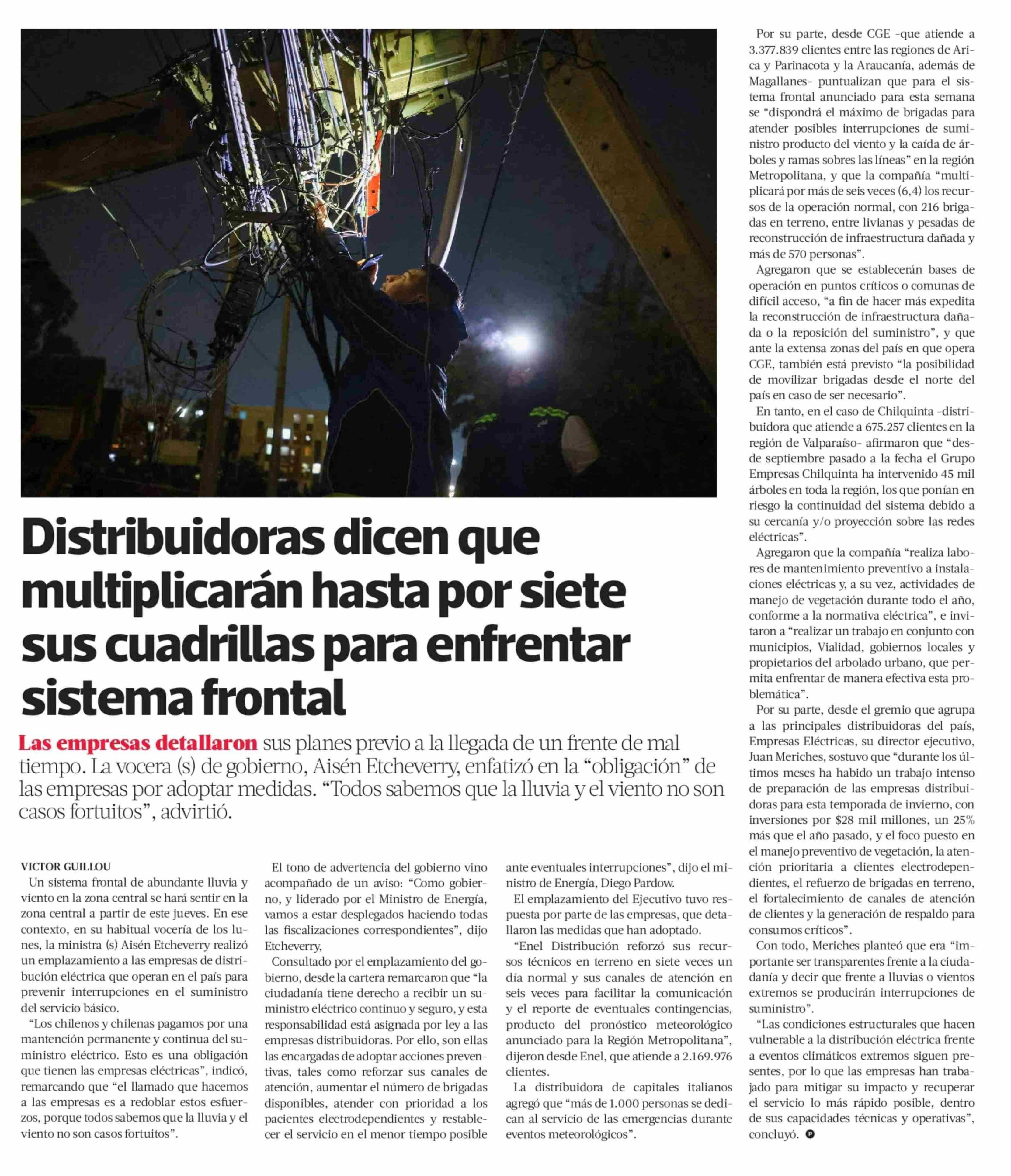 | Título: | Distribuidoras dicen que multiplicarán hasta por siete sus cuadrillas para enfrentar sistema frontal |