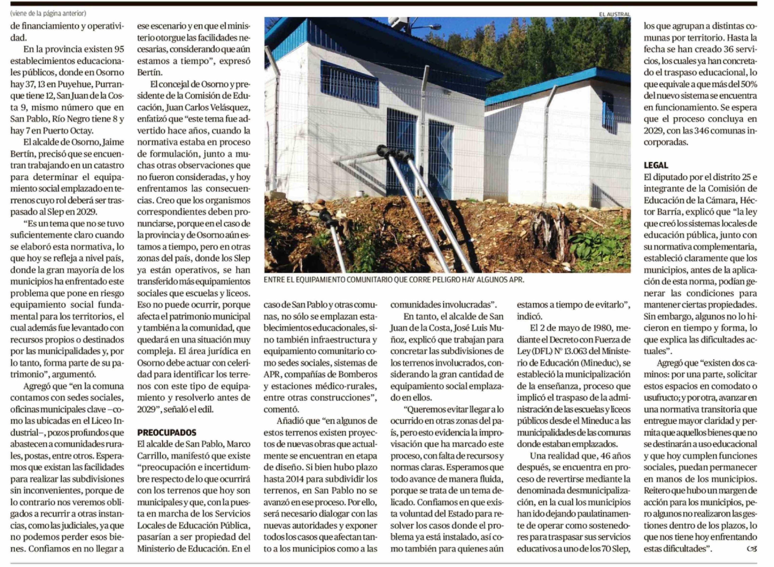 Traspaso al Slep: los municipios deberán entregar equipamiento social al Ministerio de Educación 22-03-2026 El Austral de Osorno |