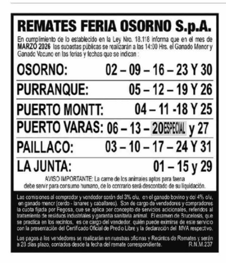 Remates: REMATES FERIA OSORNO S.p.A. 02-03-2026 Diario Austral Región de Los Ríos |