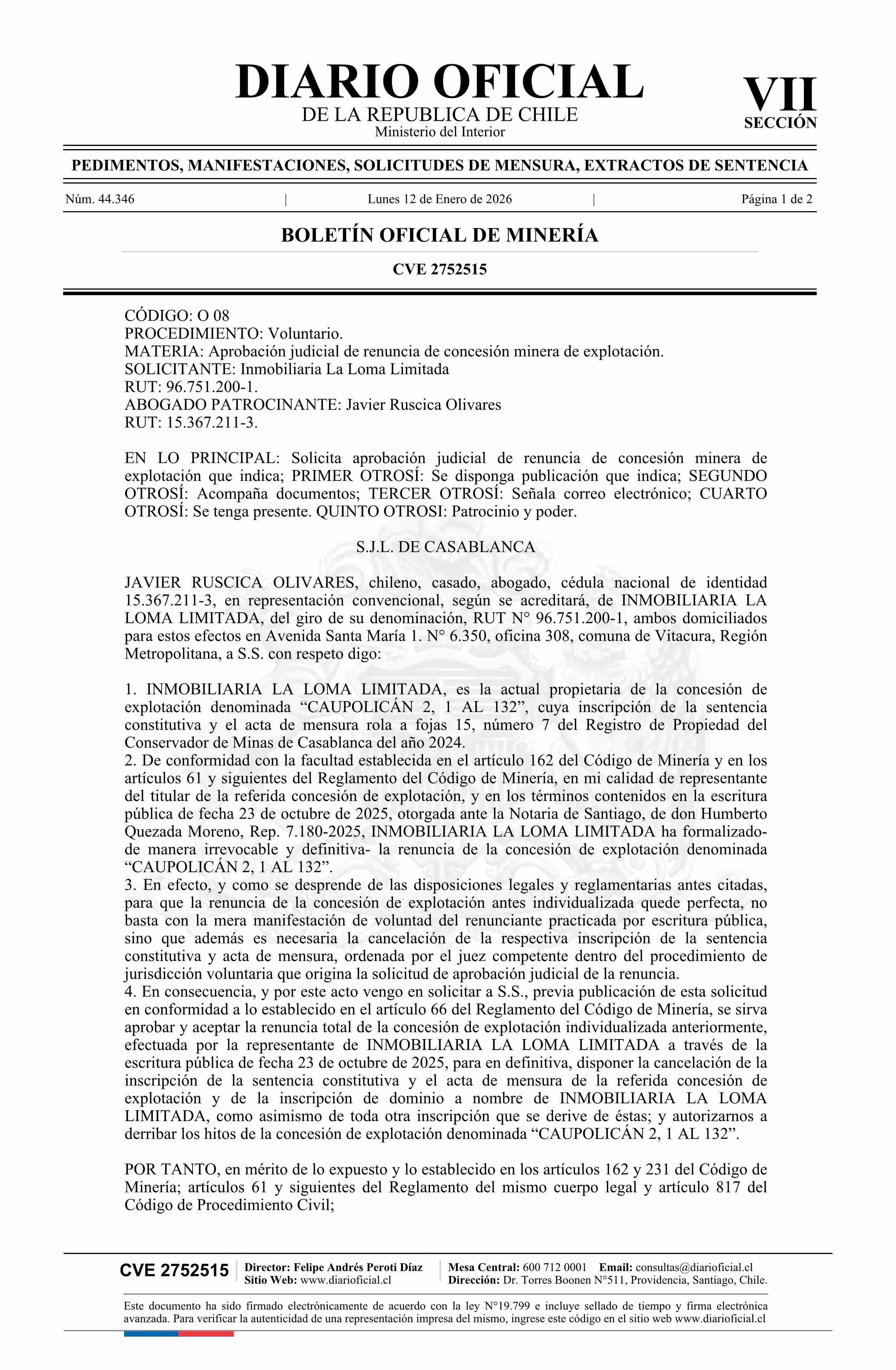 CAUPOLICÁN 2, 1 AL 132 / Inmobiliaria La Loma Limitada 12-01-2026 DIARIO OFICIAL CHILE - BOLETÍN OFICIAL DE MINERÍA |