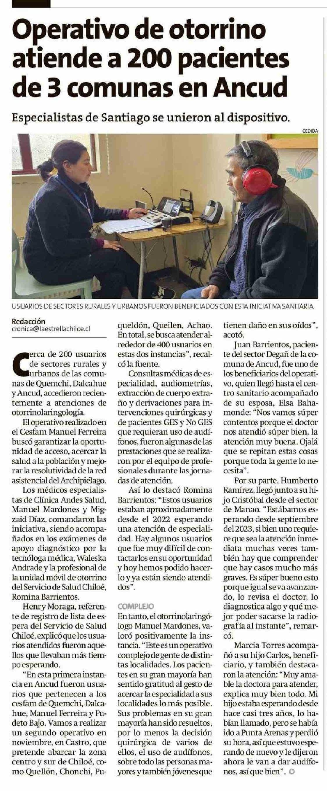 Operativo de otorrino atiende a 200 pacientes de 3 comunas en Ancud 29-10-2024 La Estrella de Chiloé |