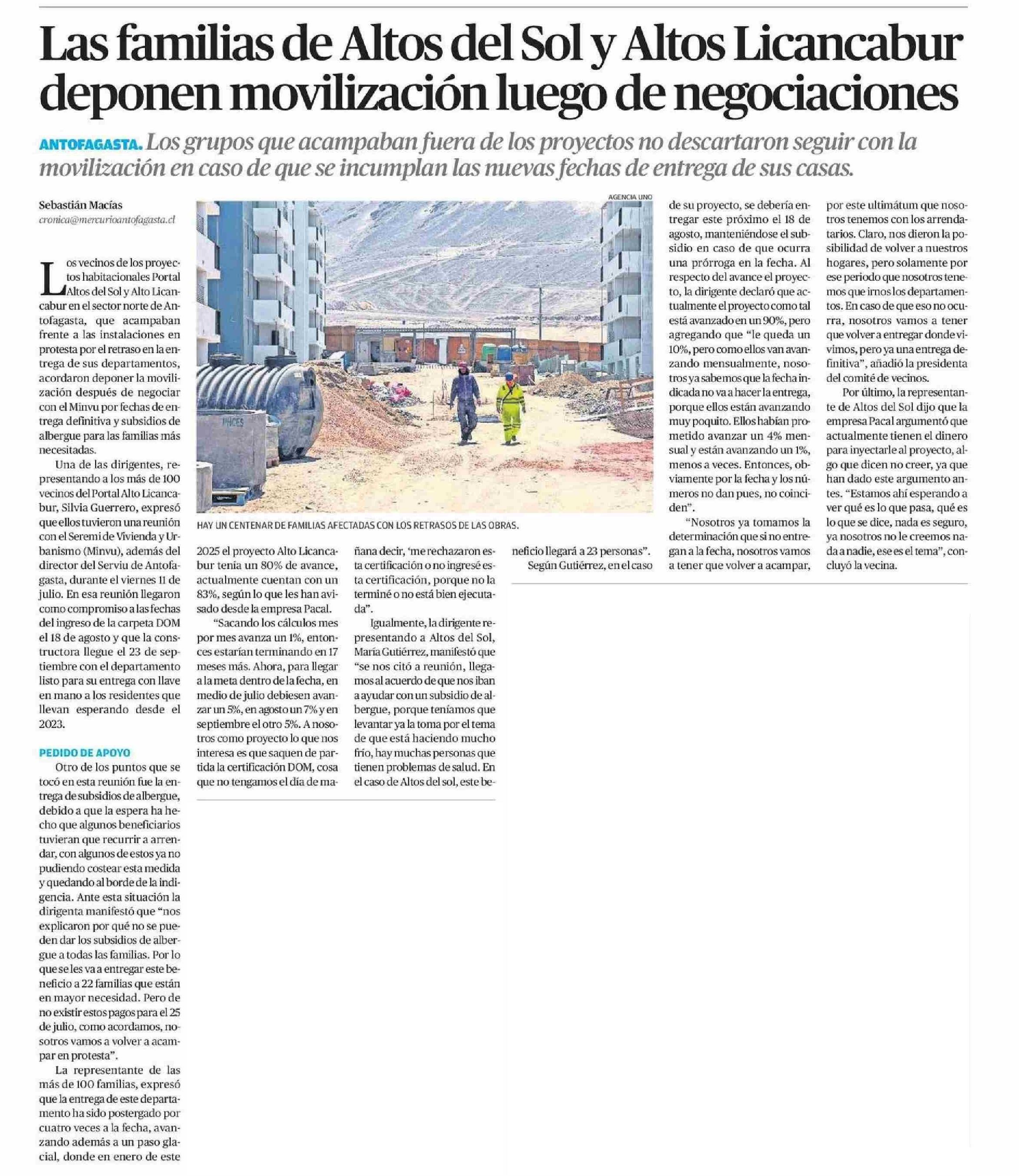 Las familias de Altos del Sol y Altos Licancabur deponen movilización luego de negociaciones 13-07-2025 El Mercurio de Antofagasta |