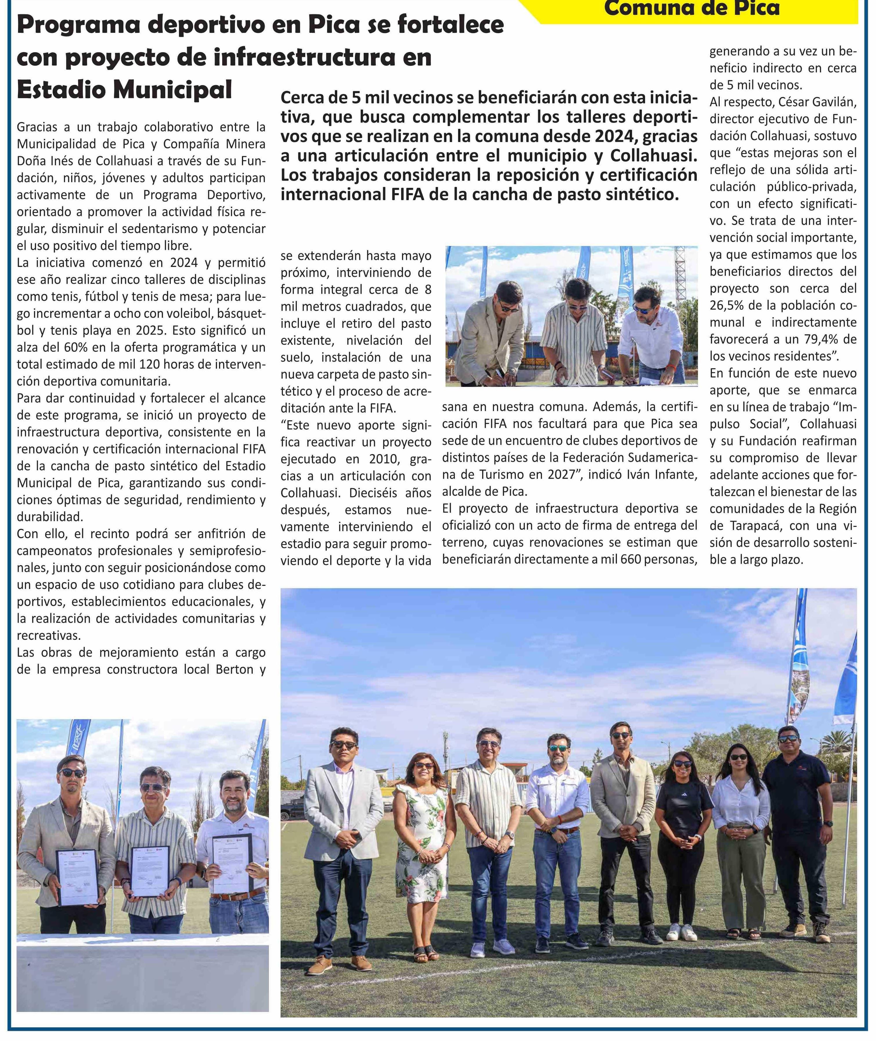 | Título: | Programa deportivo en Pica se fortalece con proyecto de infraestructura en Estadio Municipal Cerca de 5 mil vecinos se beneficiarán con esta iniciativa, que busca complementar los talleres deportivos que se realizan en la comuna desde 2024, gracias a una articulación entre el municipio y Collahuasi. |