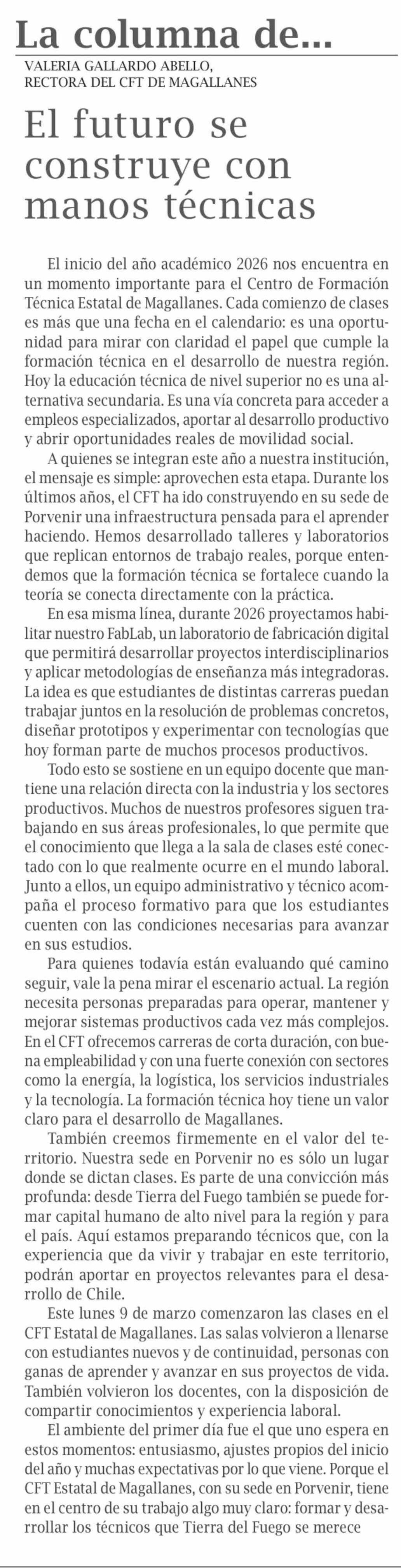 Columnas de Opinión: El futuro se construye con manos técnicas 11-03-2026 El Pingüino |