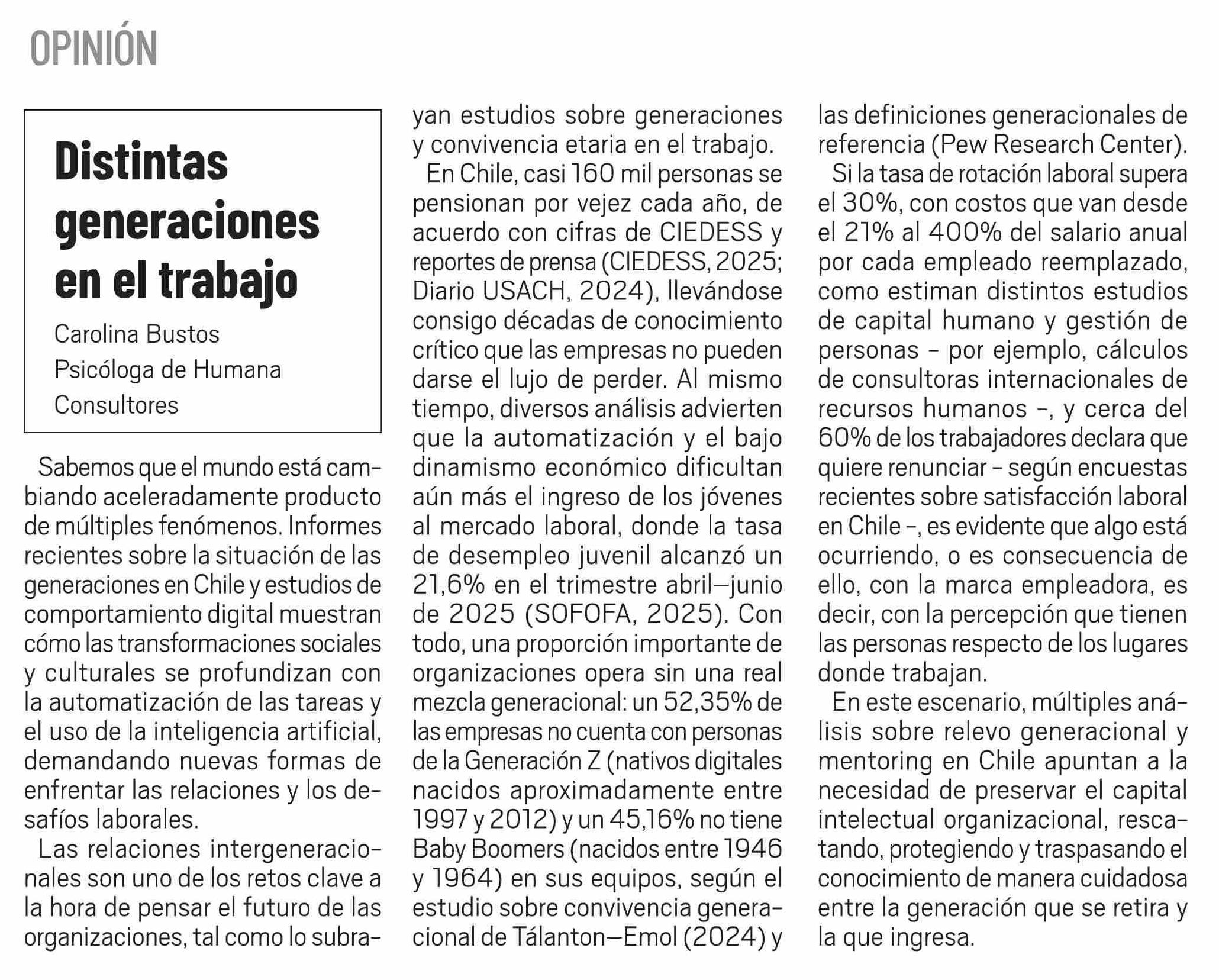 Columnas de Opinión: Distintas generaciones en el trabajo 07-01-2026 El Día |