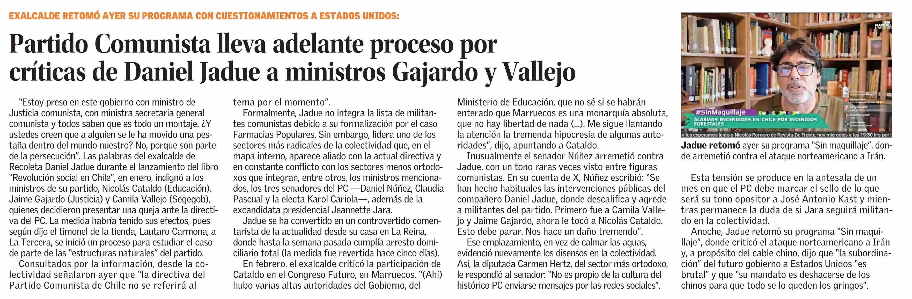 Título: Partido Comunista lleva adelante proceso por críticas de Daniel Jadue a ministros Gajardo y Vallejo
