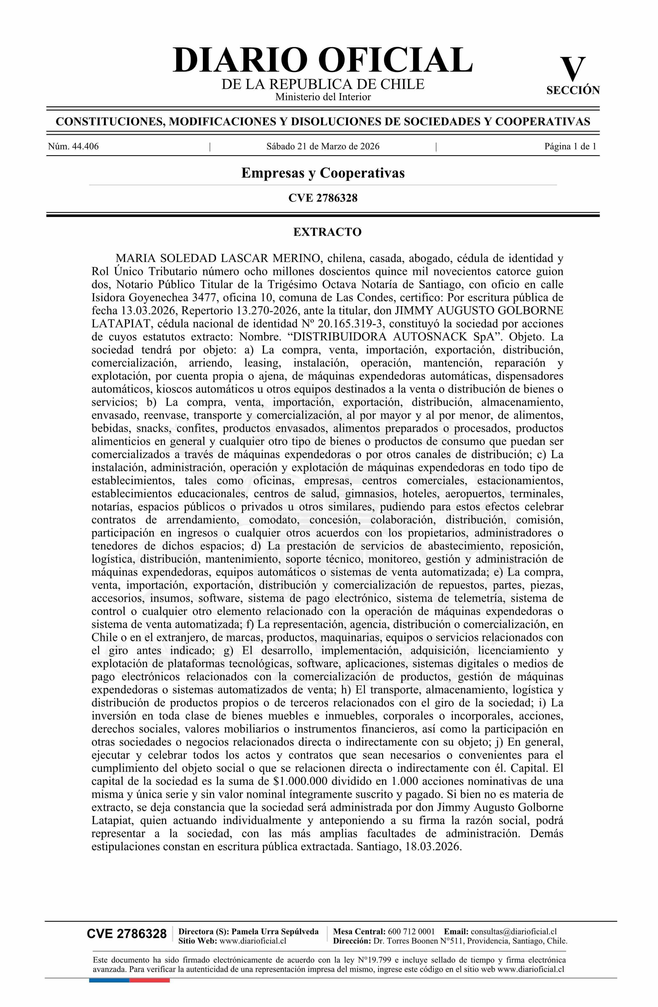 DISTRIBUIDORA AUTOSNACK SpA 21-03-2026 Diario Oficial Edición Electrónica |