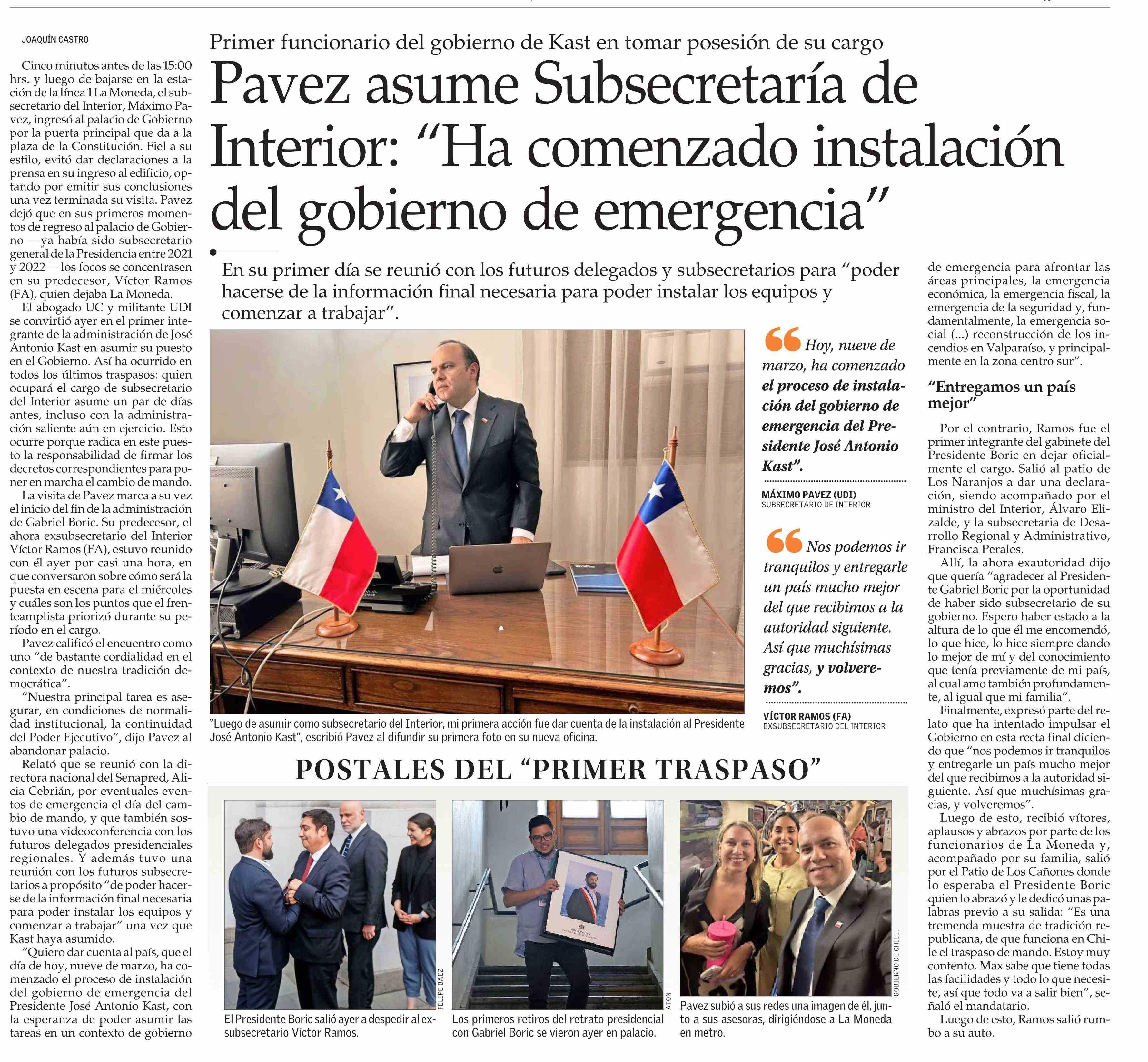 Título: Pavez asume Subsecretaría de Interior: “Ha comenzado instalación del gobierno de emergencia”