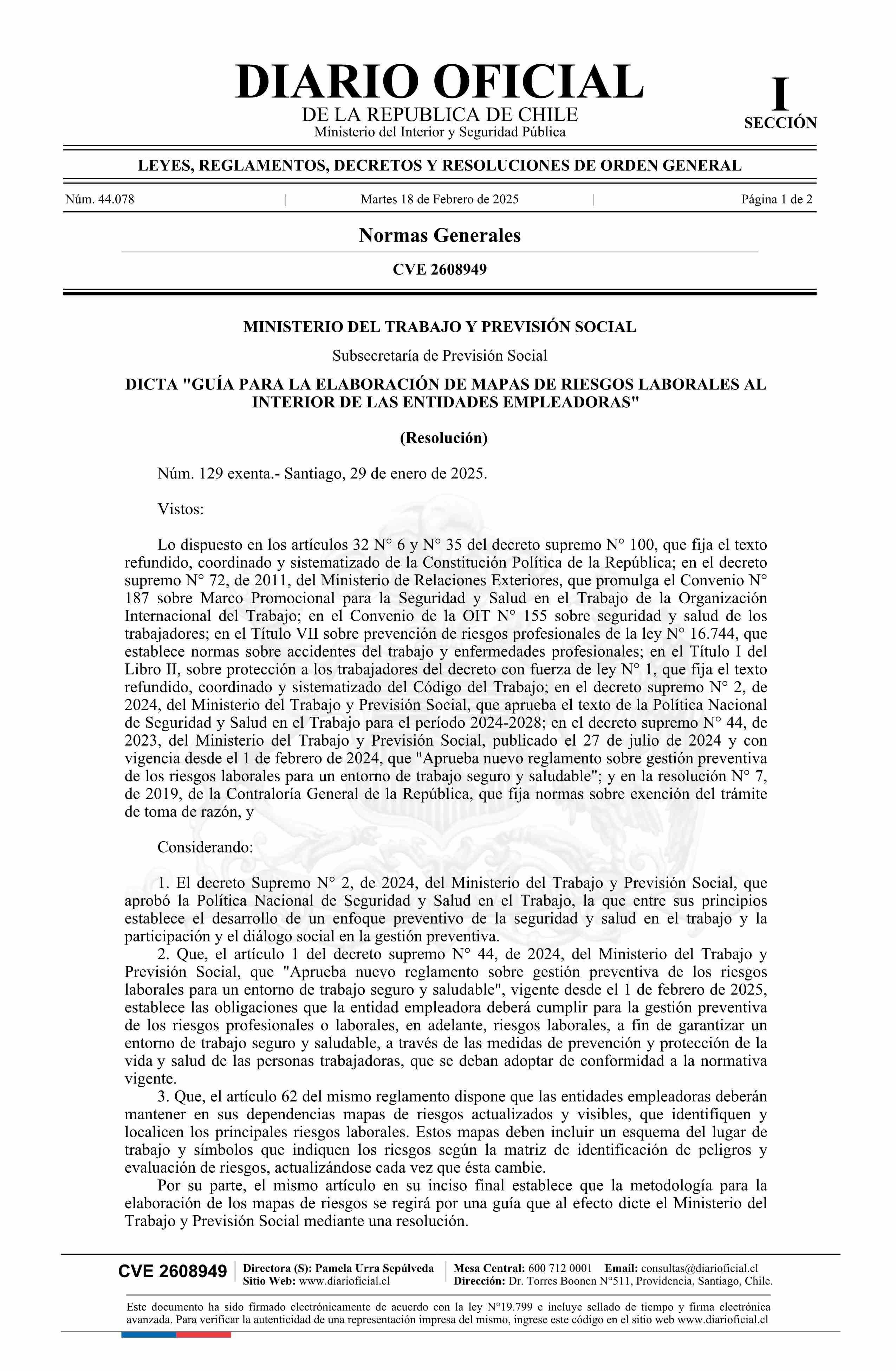 Resolución exenta número 129, de 2025.- Dicta Guía para la elaboración de Mapas de Riesgos Laborales al interior de las entidades empleadoras 18-02-2025 Diario Oficial Edición Electrónica |