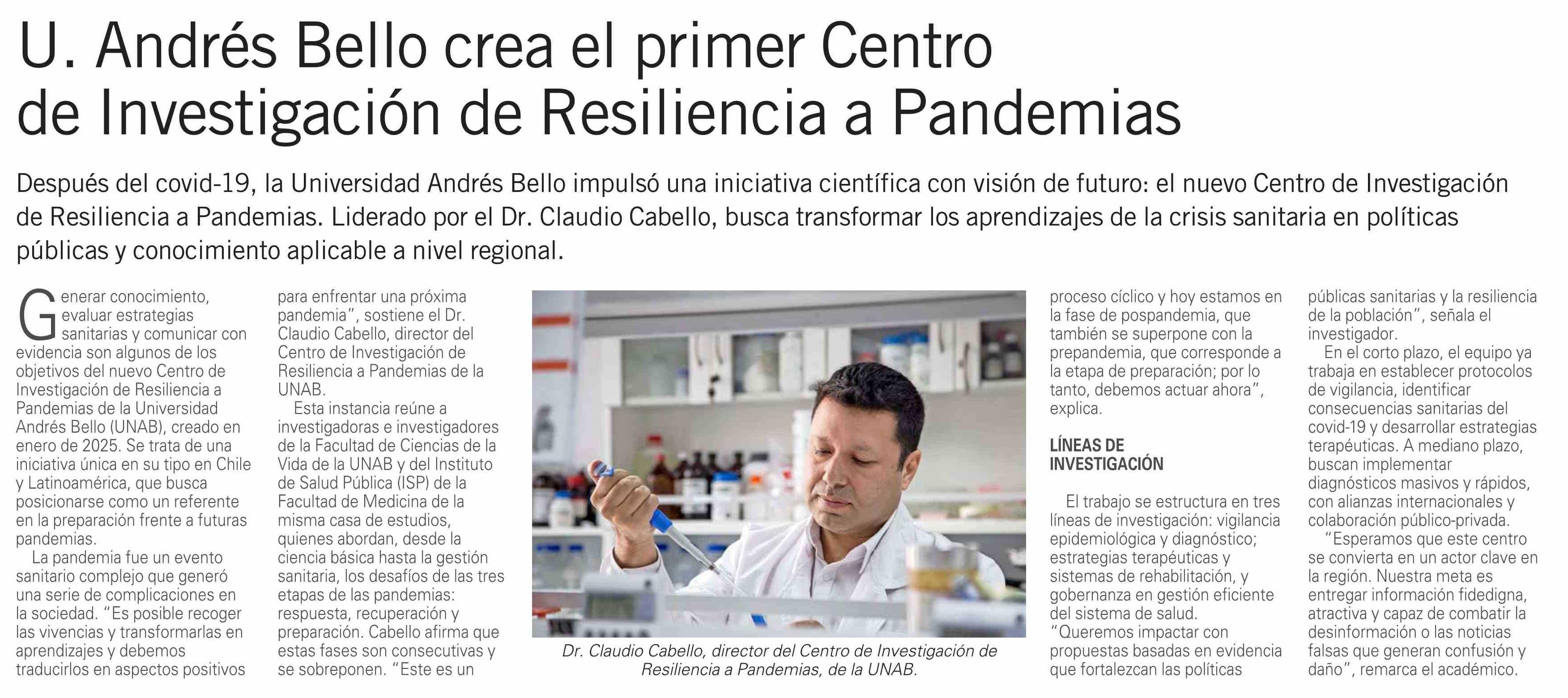 U. Andrés Bello crea el primer Centro de Investigación de Resiliencia a Pandemias 19-04-2025 El Mercurio |