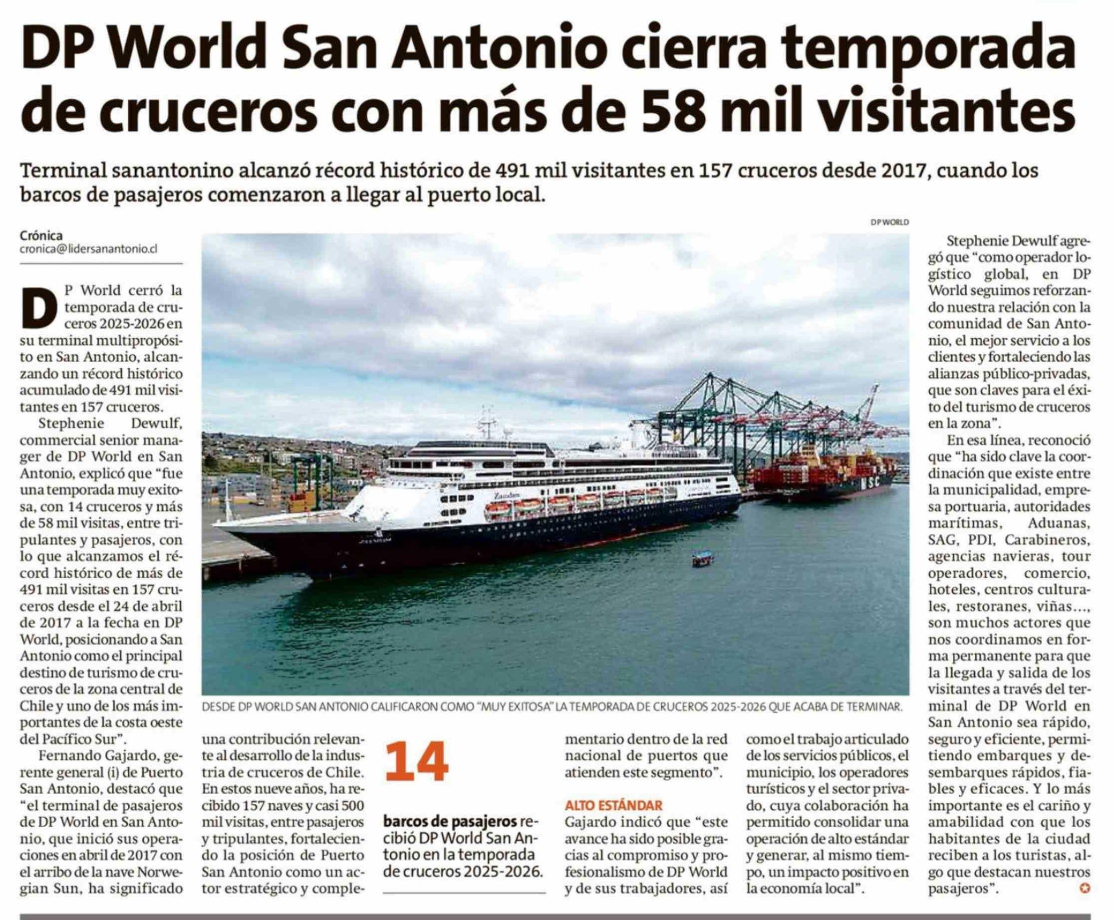 DP World San Antonio cierra temporada de cruceros con más de 58 mil visitantes 09-04-2026 El Líder |