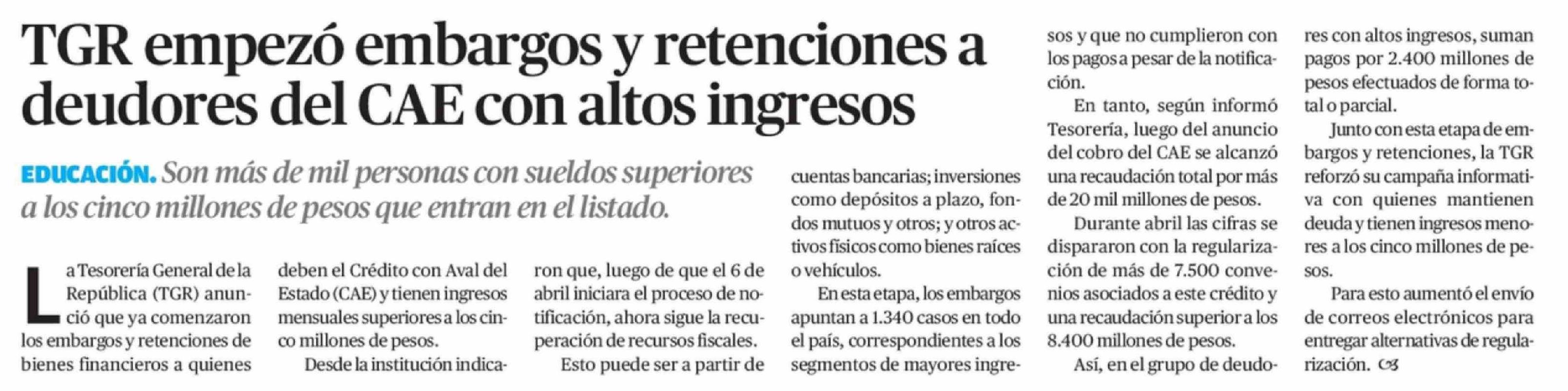 Título: TGR empezó embargos y retenciones a deudores del CAE con altos ingresos