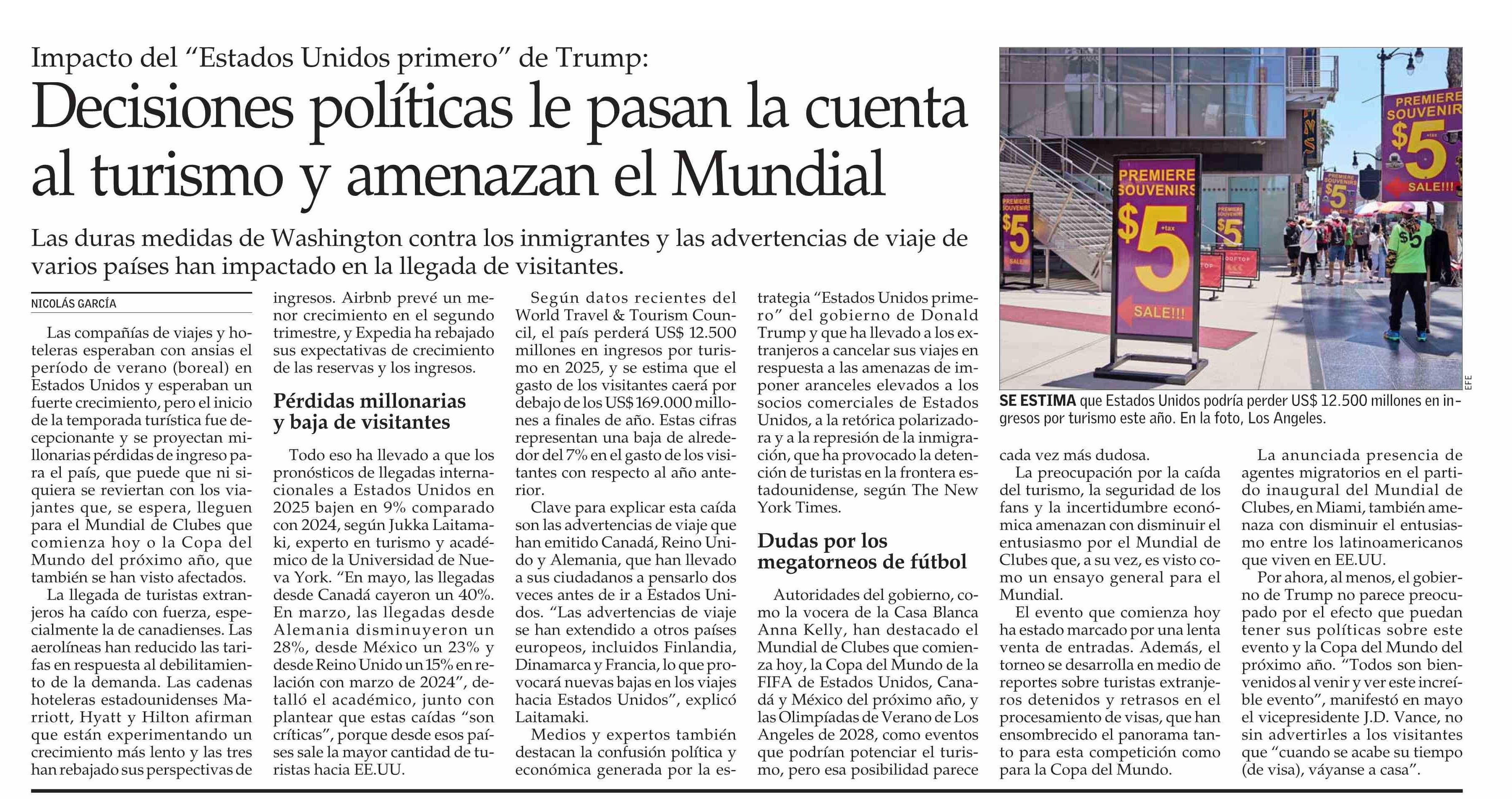 Decisiones políticas le pasan la cuenta al turismo y amenazan el Mundial 14-06-2025 El Mercurio |