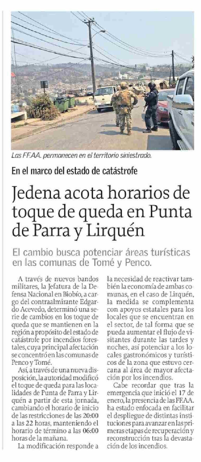 | Título: | Jedena acota horarios de toque de queda en Punta de Parra y Lirquén |