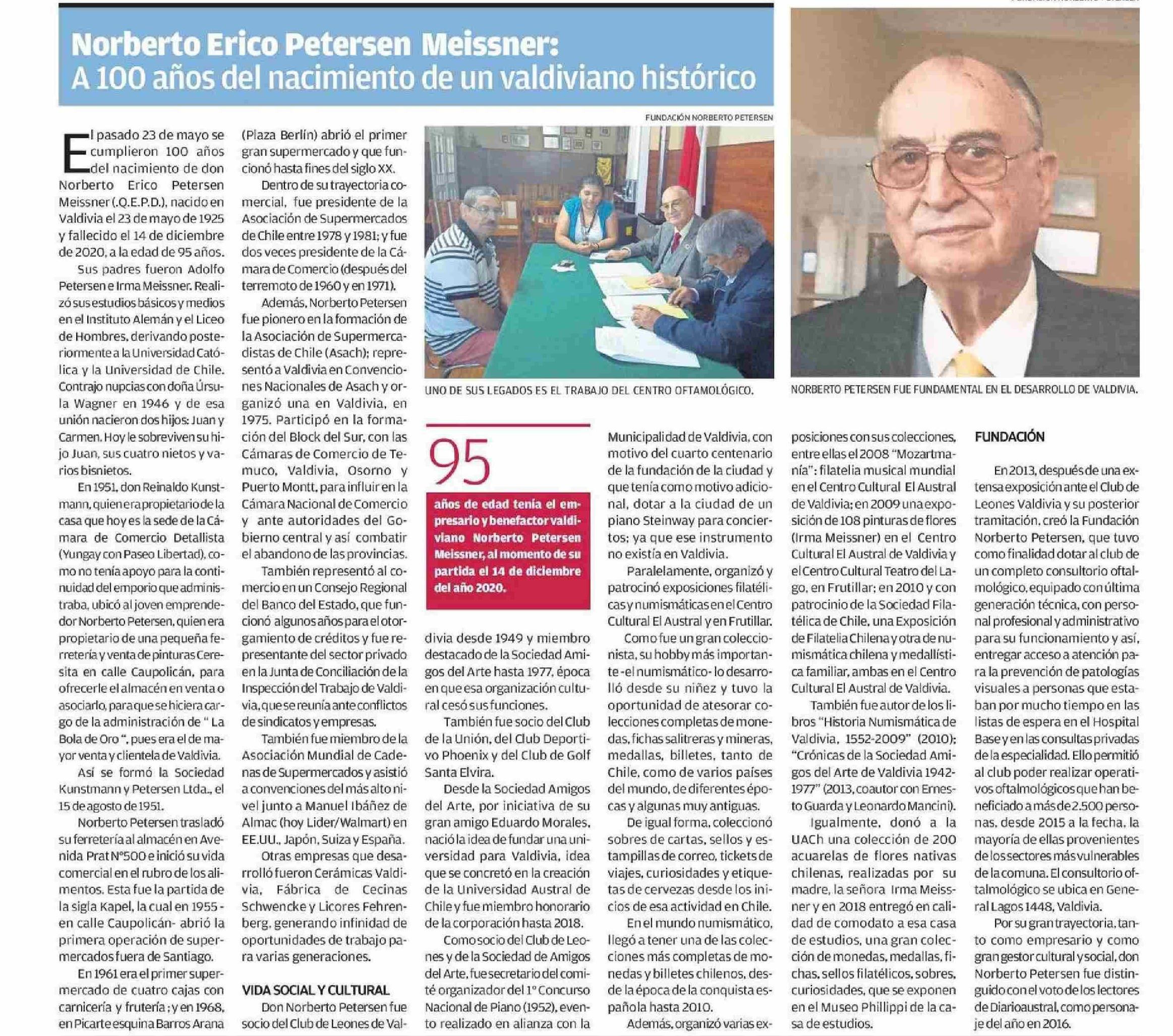 Norberto Erico Petersen Meissner: A100 años del nacimiento de un valdiviano histórico 01-06-2025 Diario Austral Región de Los Ríos |