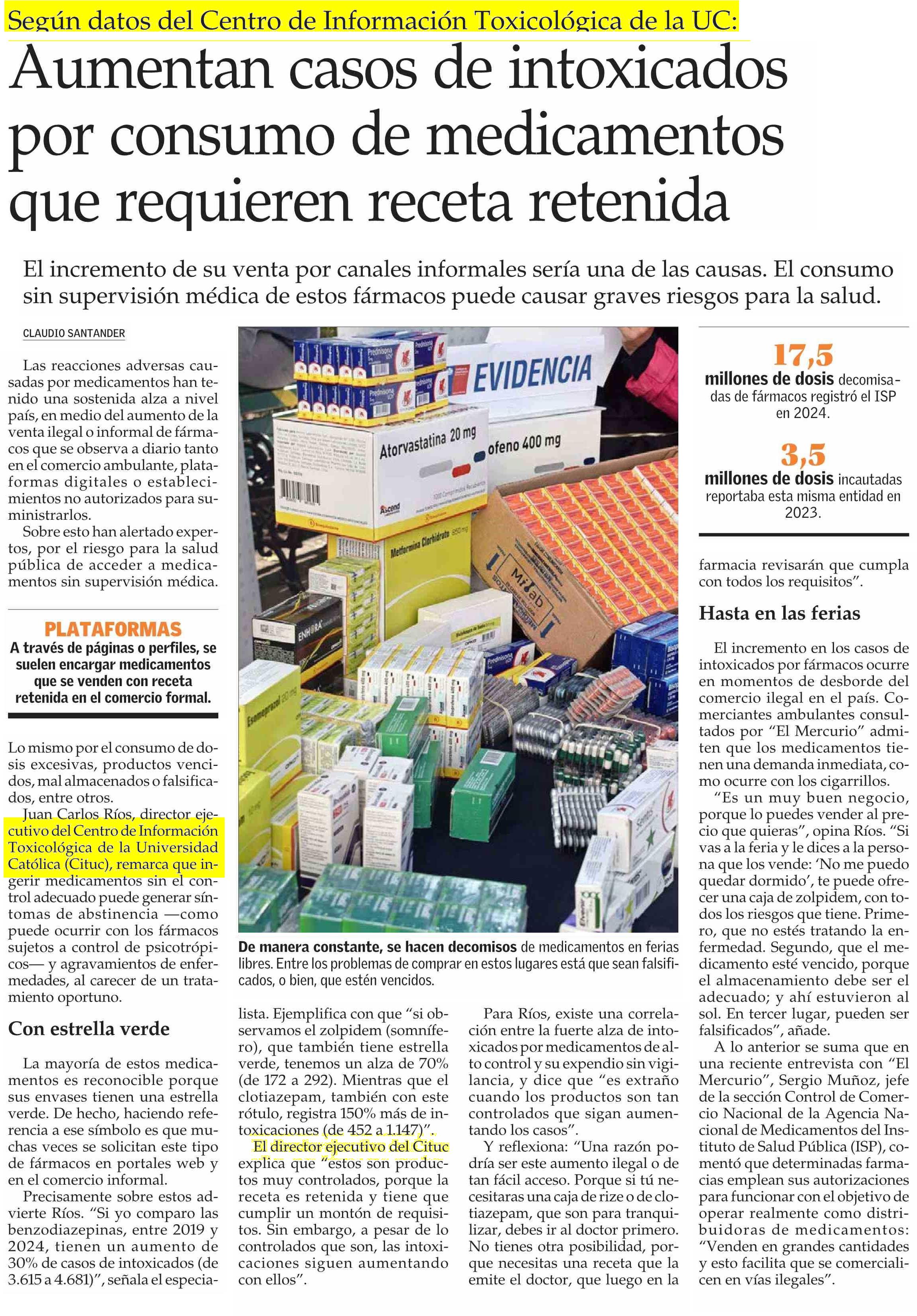 Aumentan casos de intoxicados por consumo de medicamentos que requieren receta retenida 19-05-2025 El Mercurio |