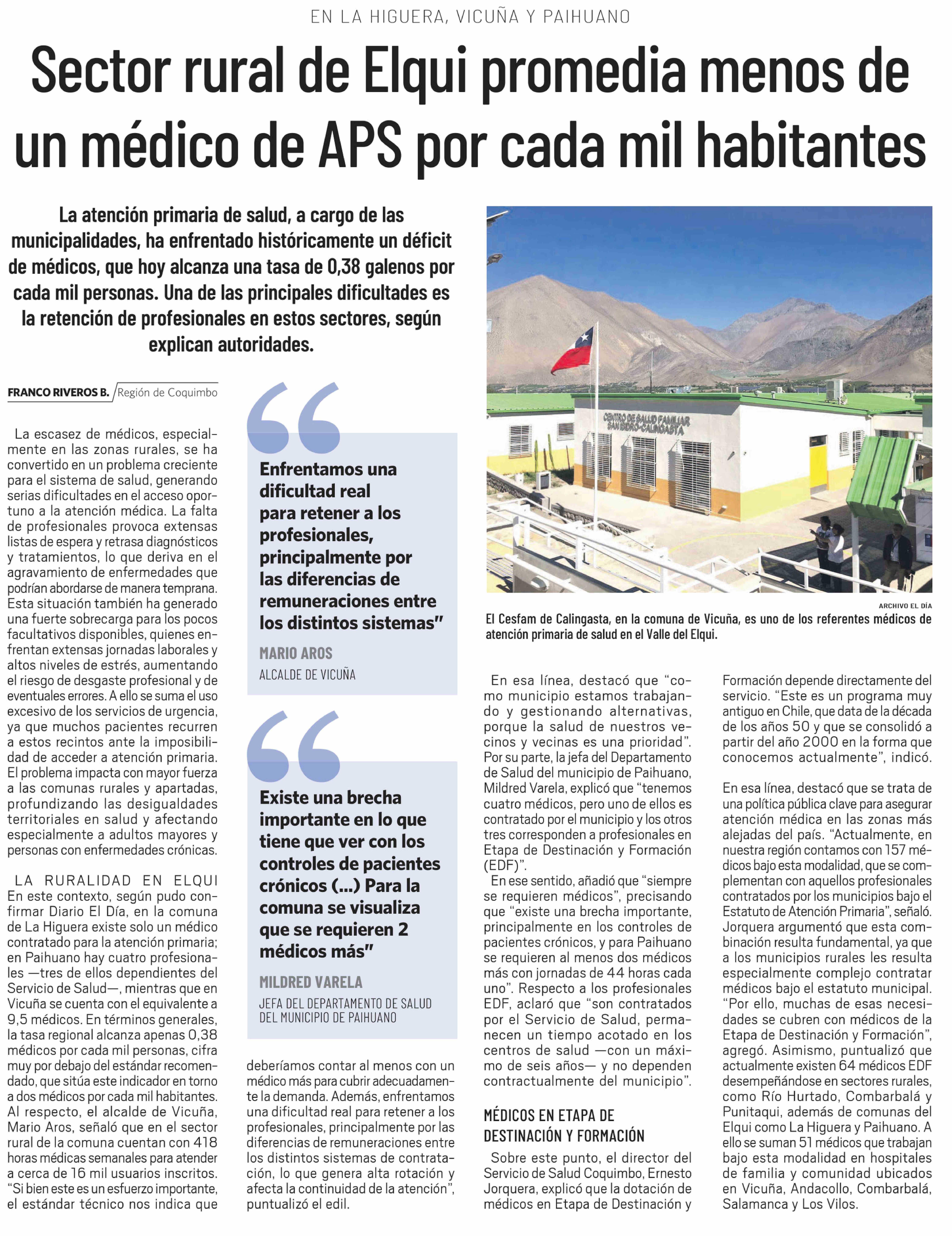Sector rural de Elqui promedia menos de un médico de APS por cada mil habitantes 01-02-2026 El Día |