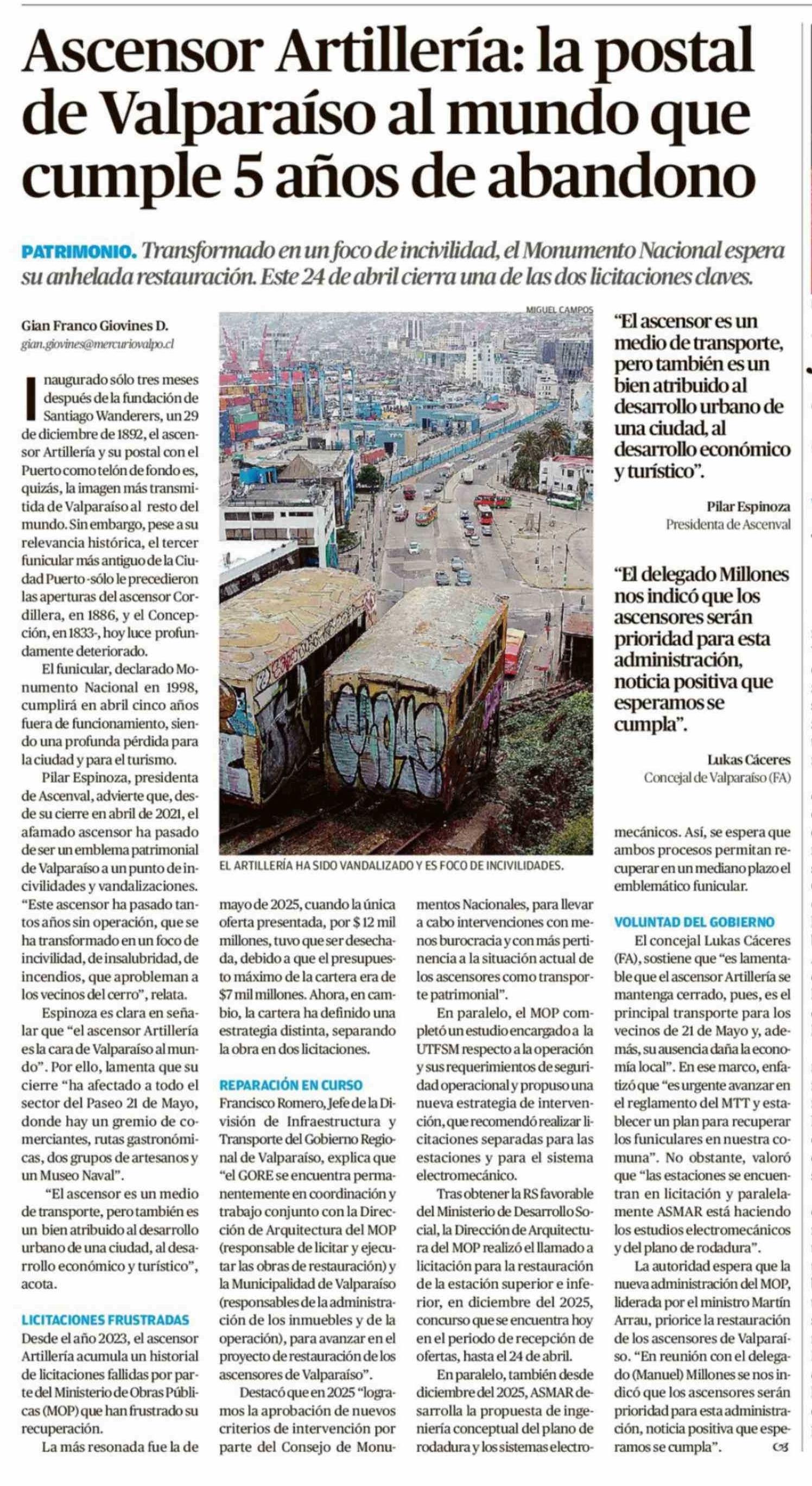Ascensor Artillería: la postal de Valparaíso al mundo que cumple 5 años de abandono 15-03-2026 El Mercurio de Valparaíso |