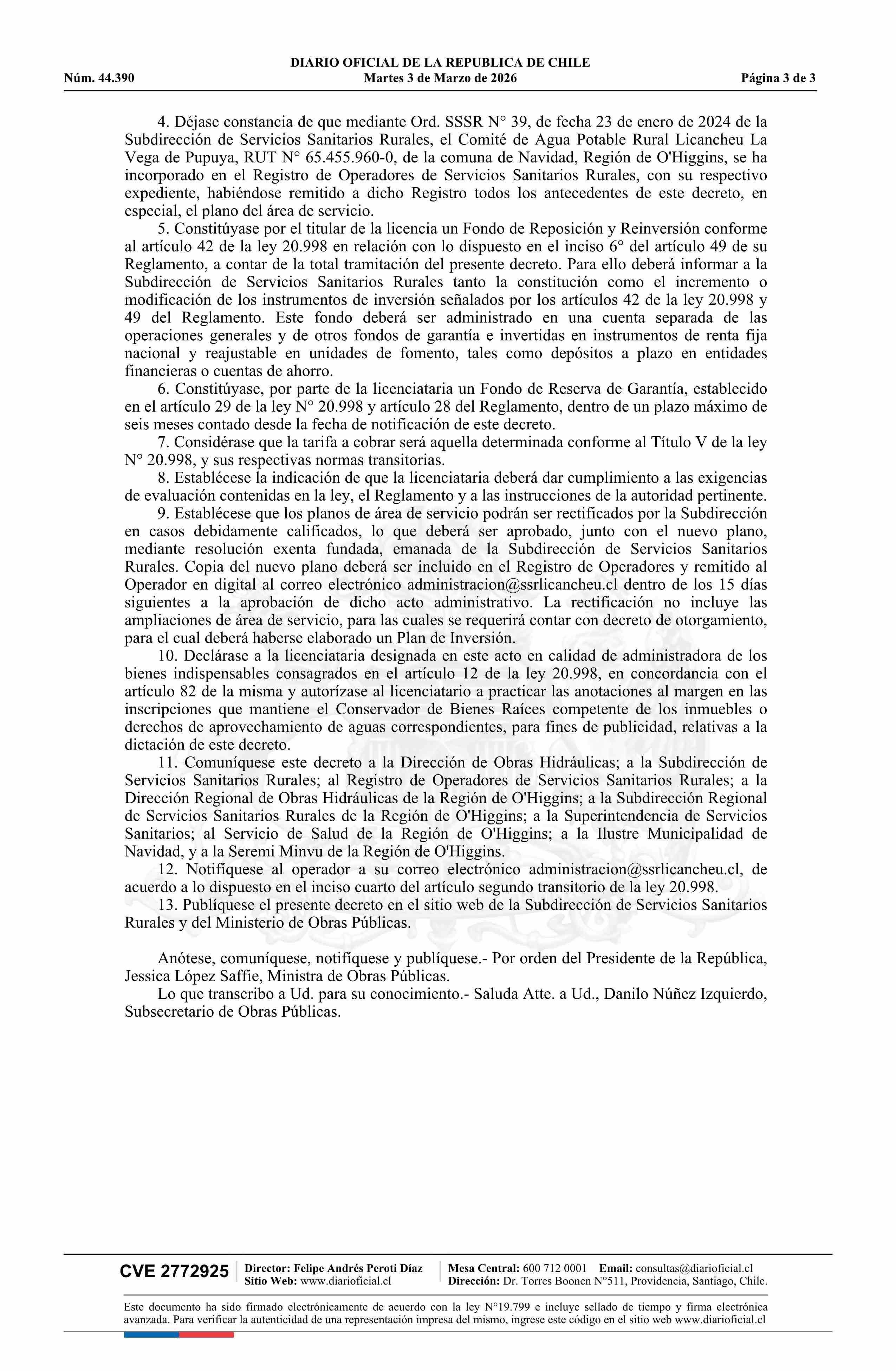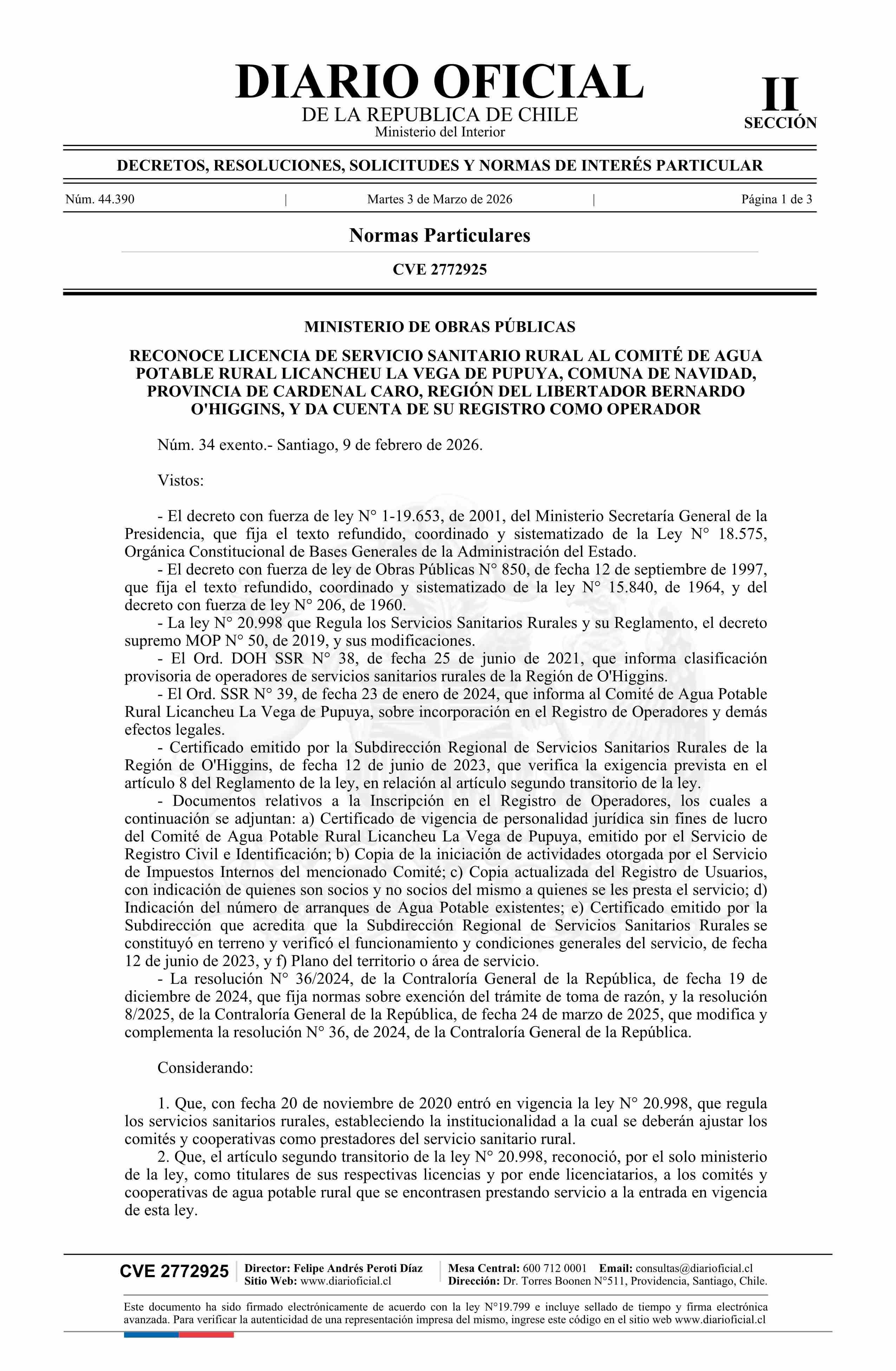 Decreto exento número 34, de 2026.- Reconoce licencia de servicio sanitario rural al Comité de Agua Potable Rural Licancheu La Vega de Pupuya, comuna de Navidad, provincia de Cardenal Caro, Región del Libertador Bernardo O'Higgins, y da cuenta de su registro como operador