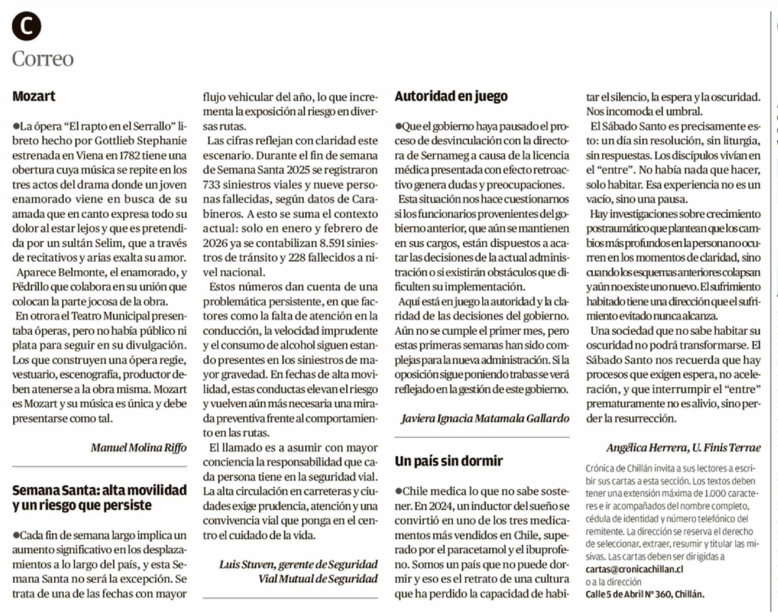 Cartas: Mozart 04-04-2026 Crónica de Chillán |