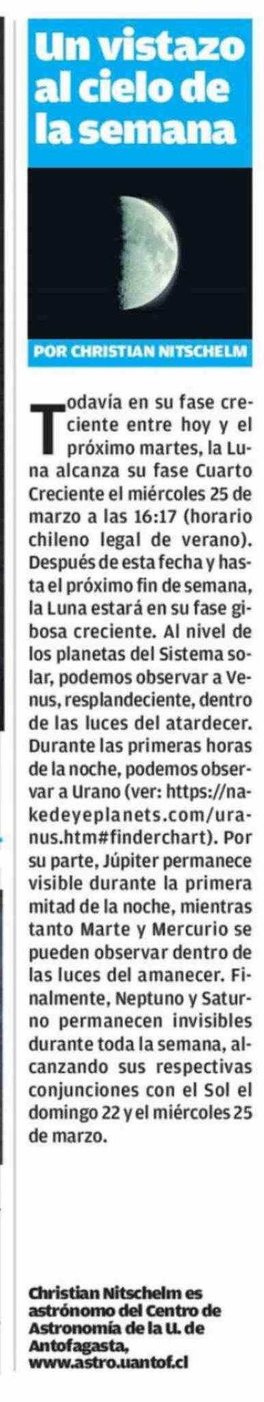 Un vistazo al cielo de la semana 22-03-2026 El Mercurio de Antofagasta |