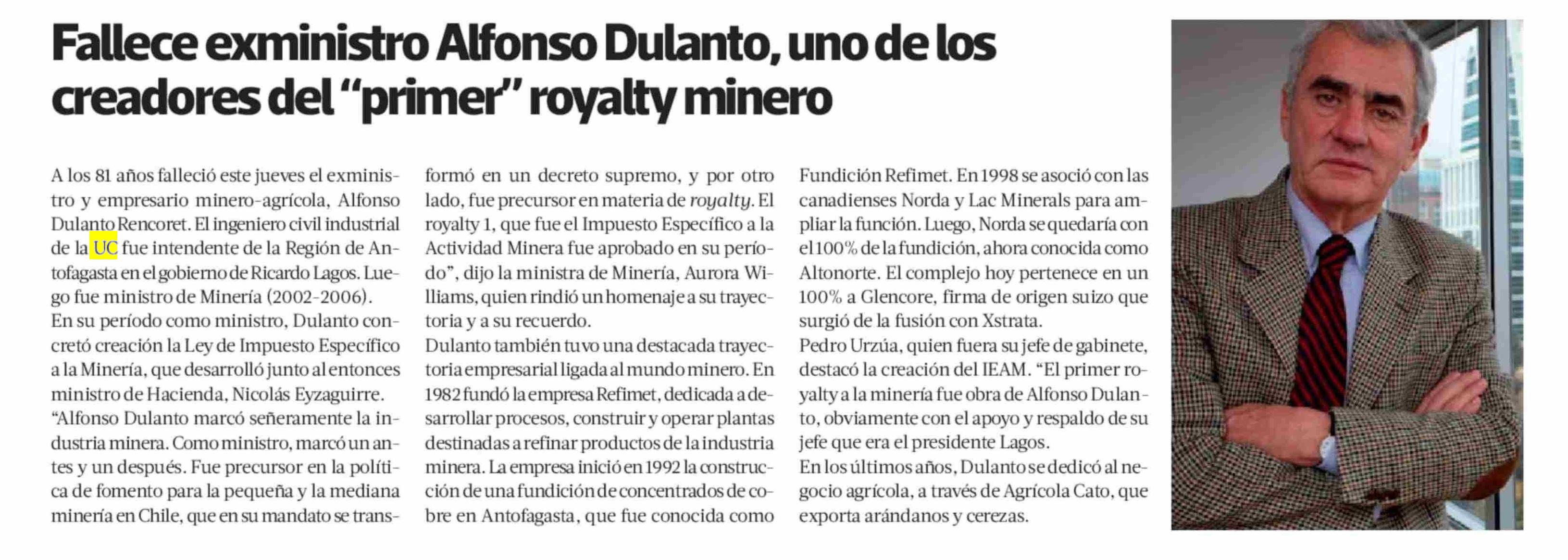 Fallece exministro Alfonso Dulanto, uno de los creadores del "primer" royalty minero 24-01-2025 La Tercera |