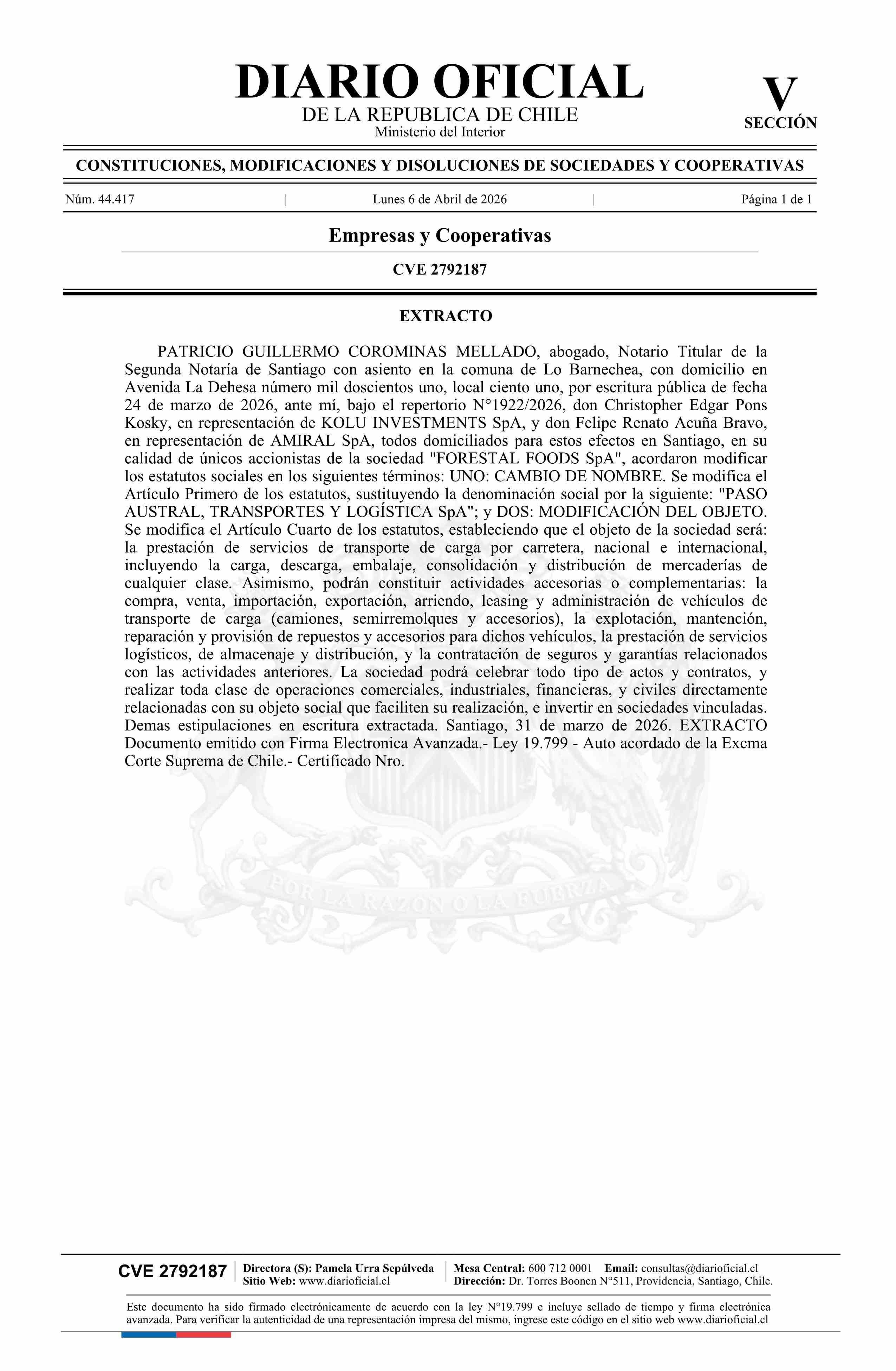 Paso Austral, Transportes y Logística SpA 78.163.699-1* 06-04-2026 Diario Oficial Edición Electrónica |