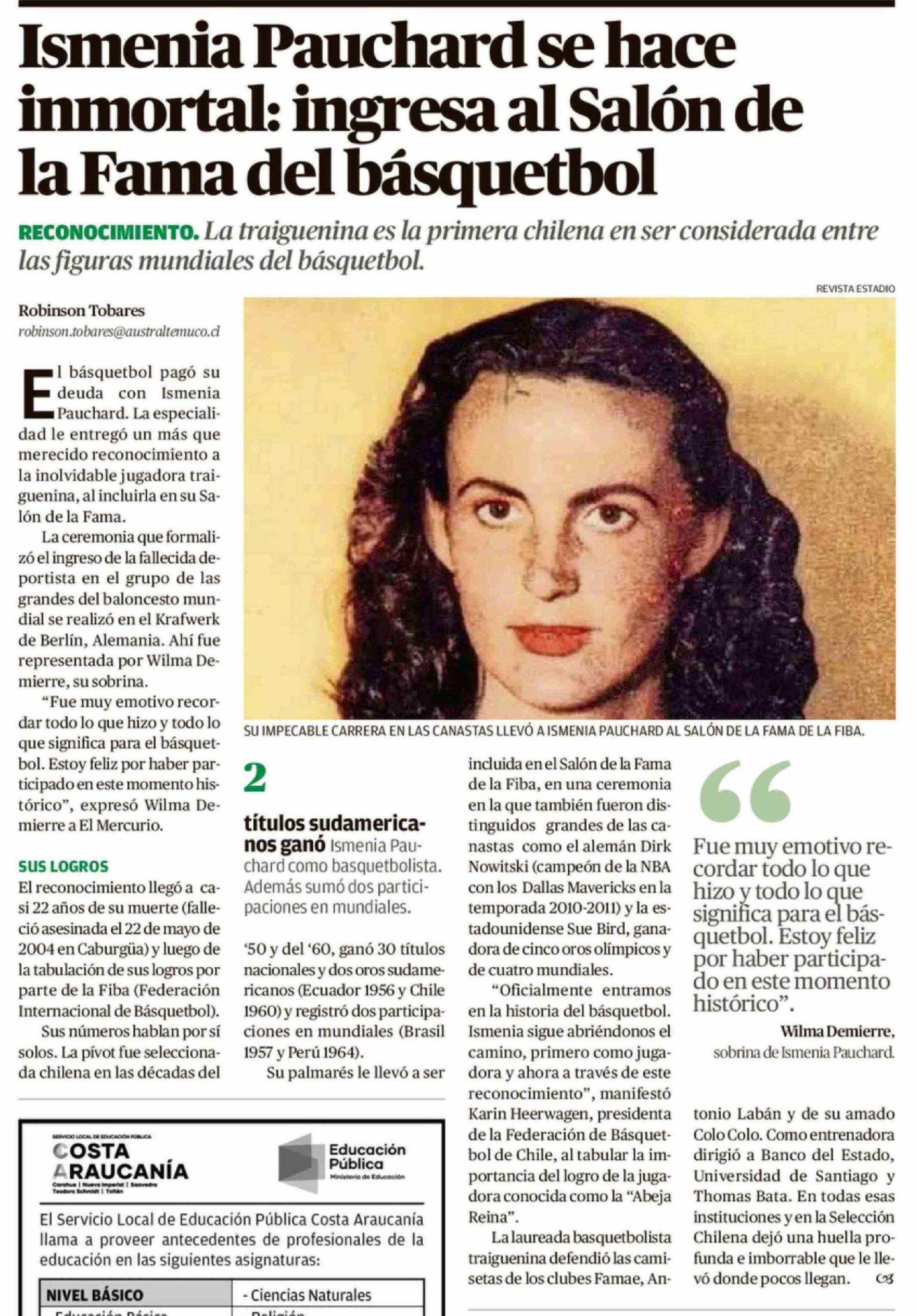 Ismenia Pauchard se hace inmortal: ingresa al Salón de la Fama del básquetbol 23-04-2026 El Austral de la Araucanía |