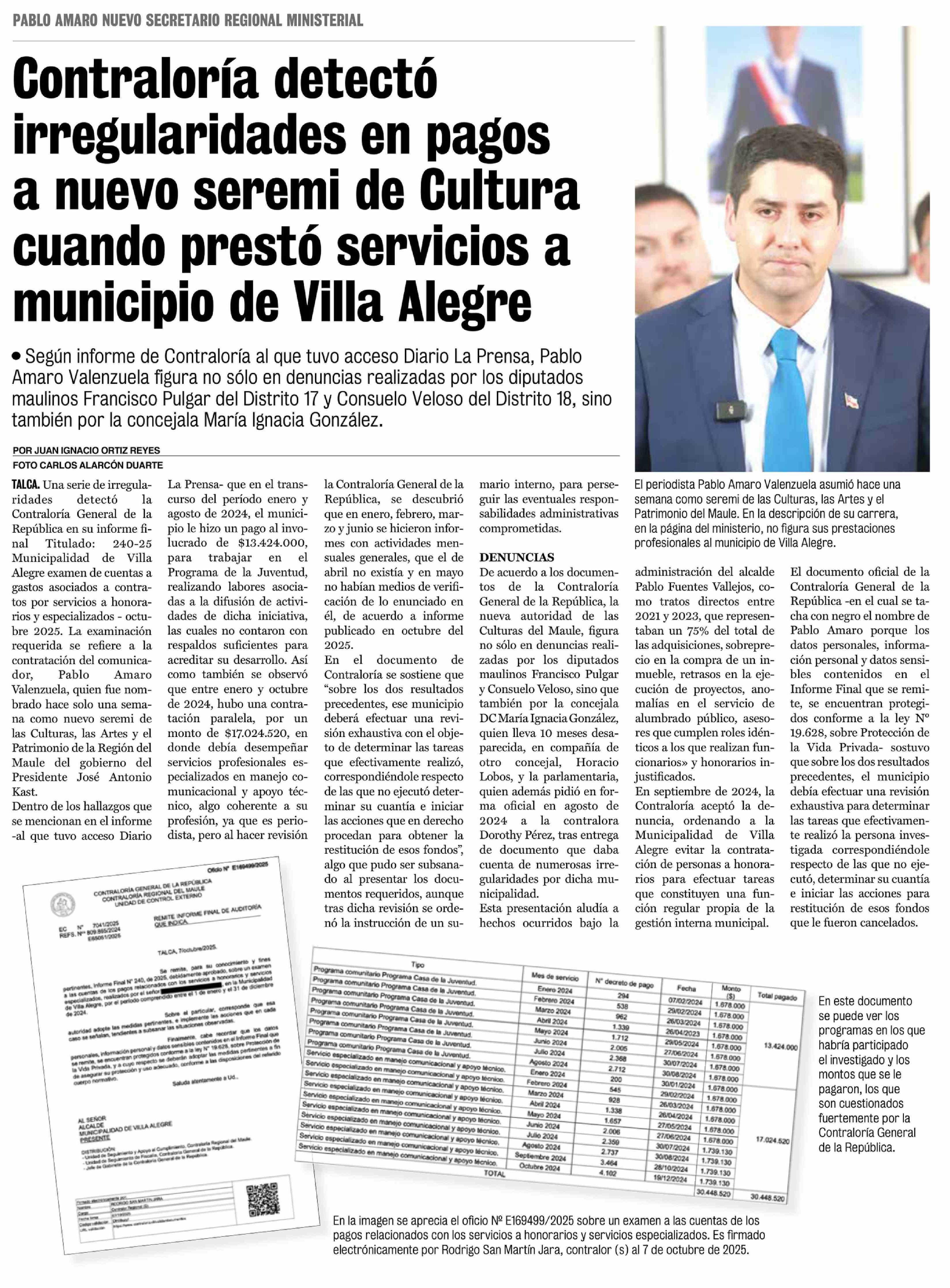 Contraloría detectó irregularidades en pagos a nuevo seremi de Cultura cuando presto servicios a municipio de Villa Alegre 07-04-2026 La Prensa de Curicó |
