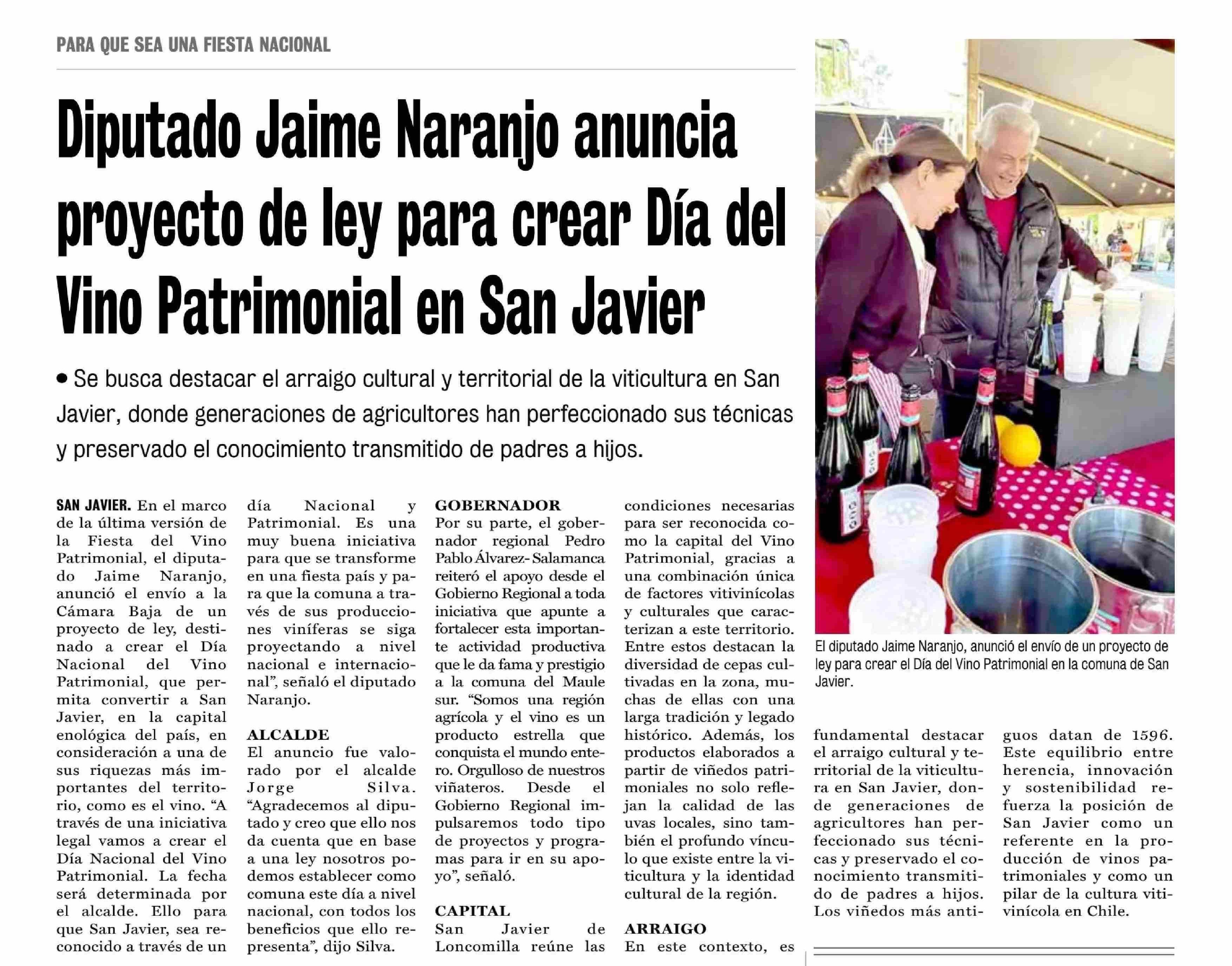 Diputado Jaime Naranjo anuncia proyecto de ley para crear Día del Vino Patrimonial en San Javier 03-05-2025 La Prensa de Curicó |