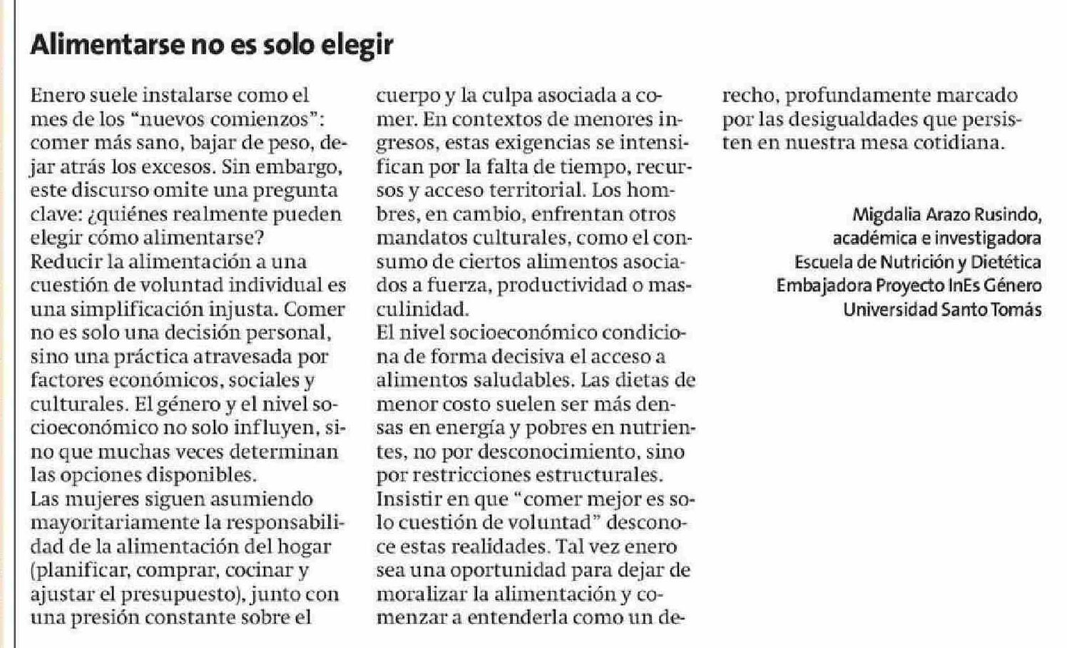 Cartas: Alimentarse no es solo elegir 08-01-2026 La Estrella de Iquique |