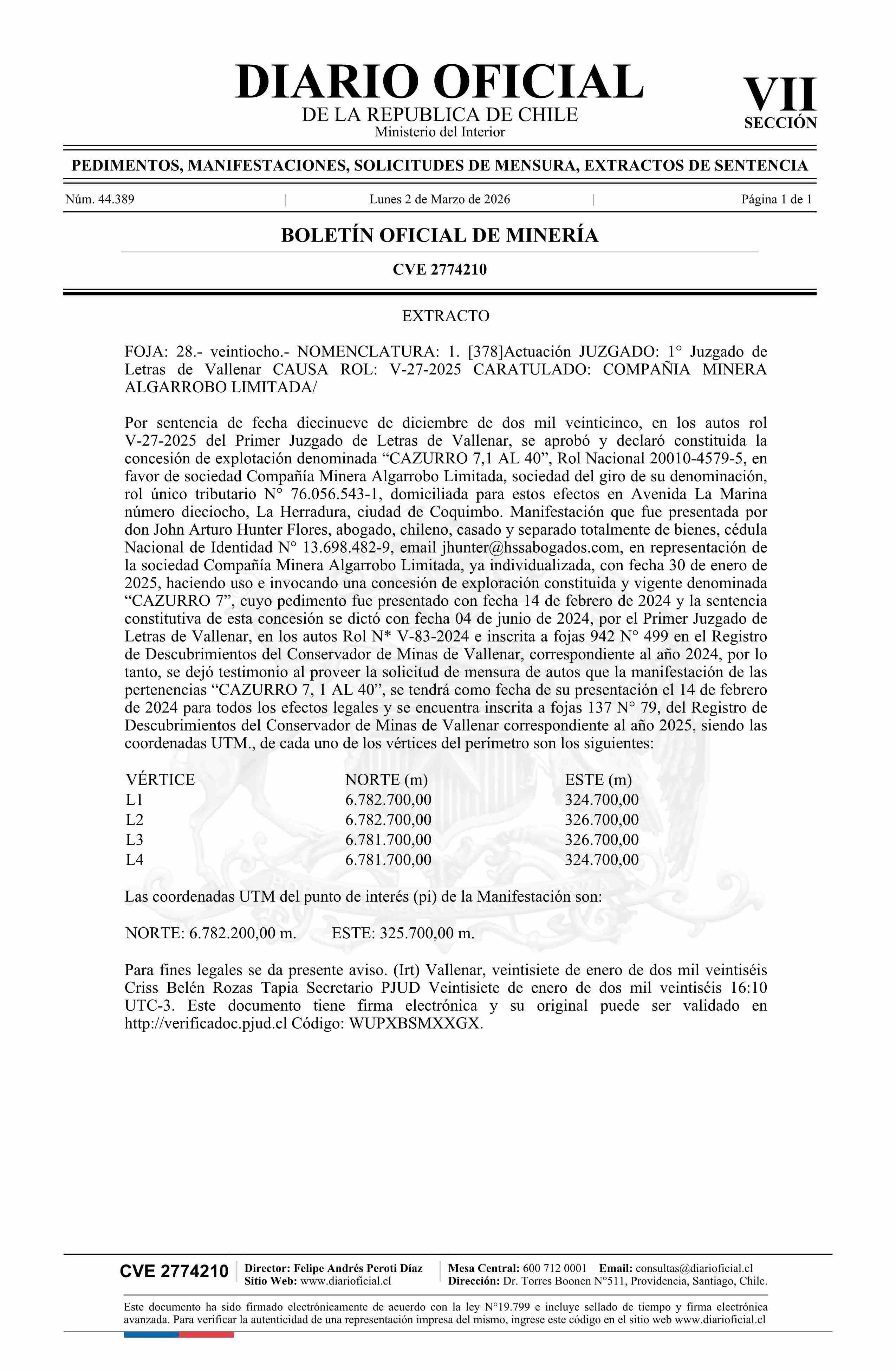 CAZURRO 7, 1 AL 40 / Compañía Minera Algarrobo Limitada 02-03-2026 DIARIO OFICIAL CHILE - BOLETÍN OFICIAL DE MINERÍA |