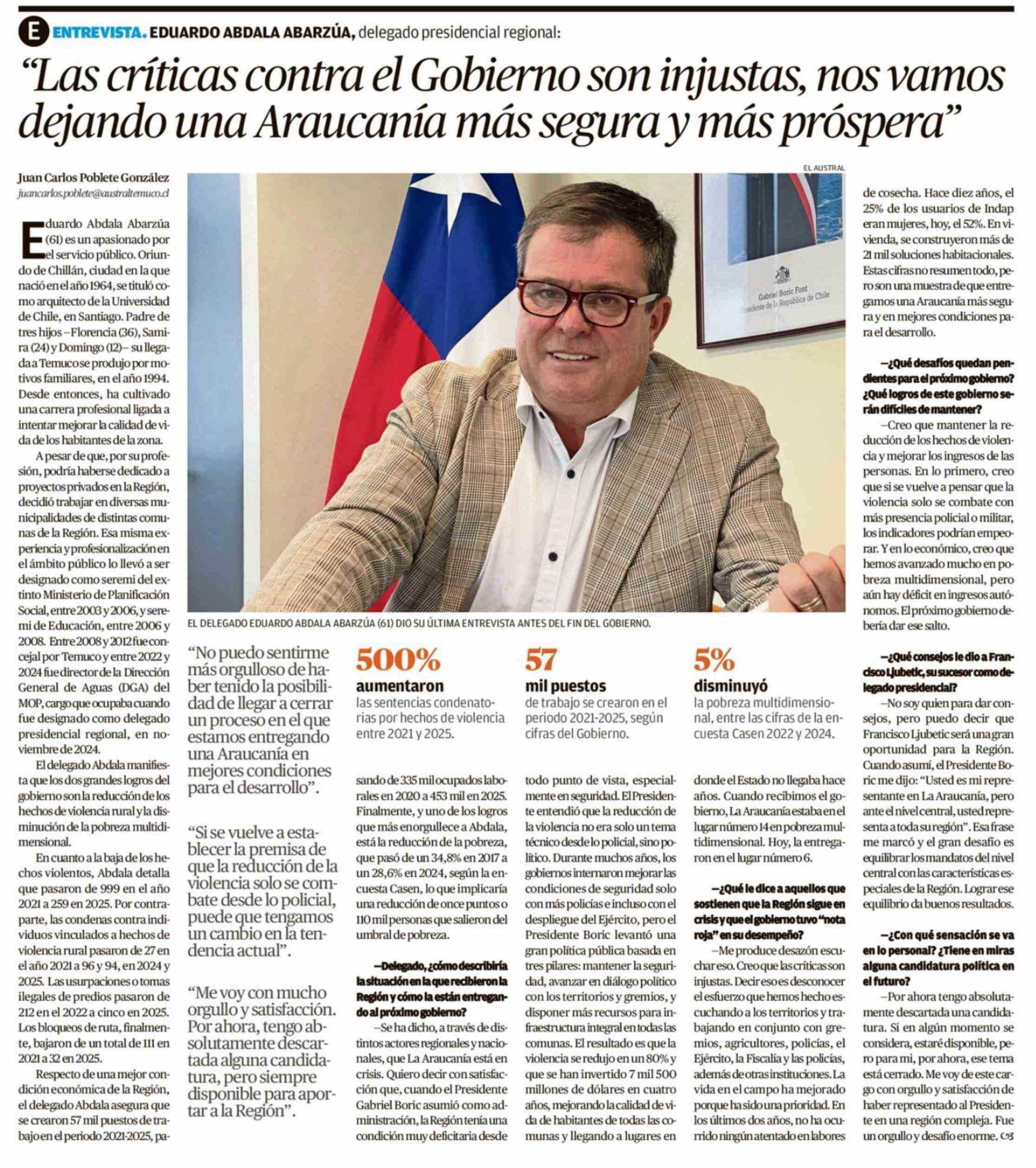 Título: "Las críticas contra el Gobierno son injustas, nos vamos dejando una Araucanía más segura y más próspera"