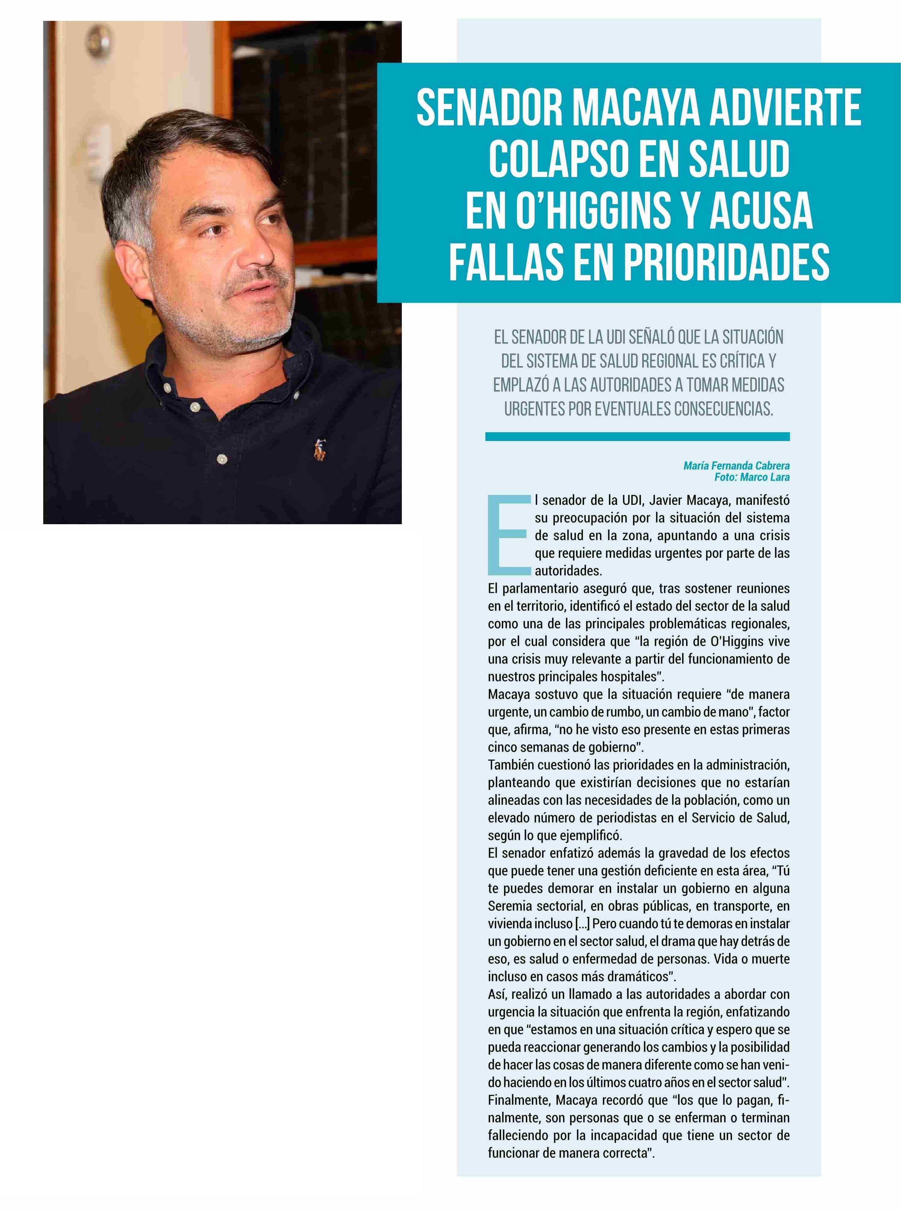 | Título: | SENADOR MACAYA ADVIERTE COLAPSO EN SALUD EN O'HIGGINS Y ACUSA FALLAS EN PRIORIDADES |