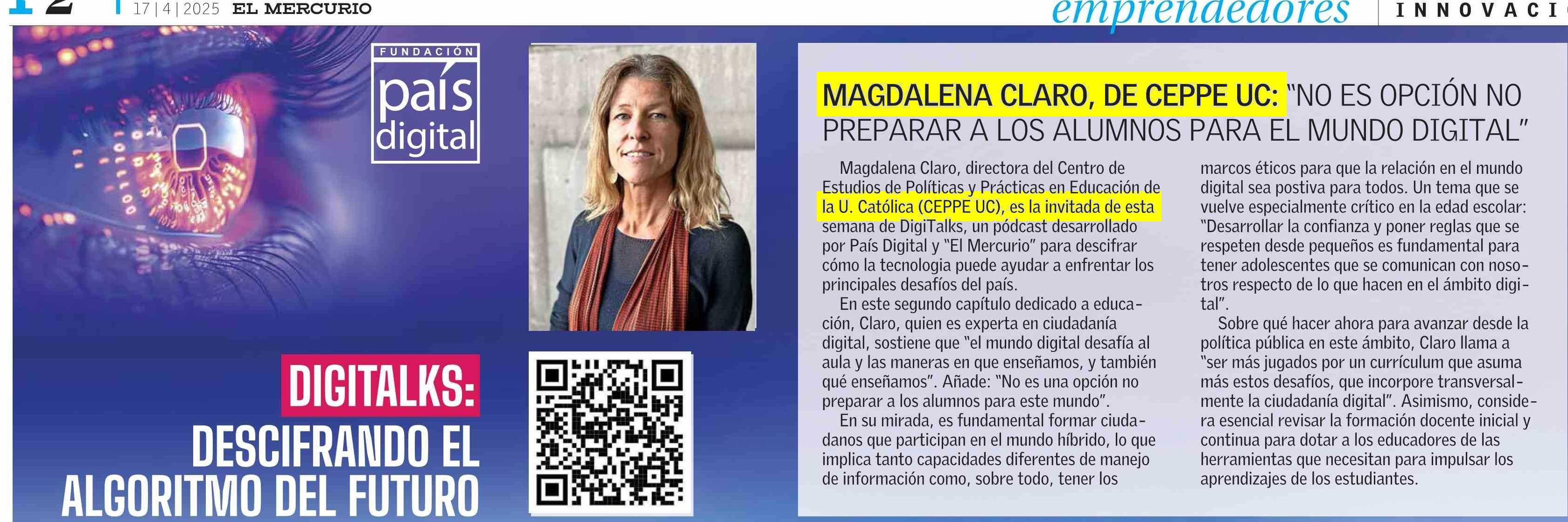 MAGDALENA CLARO, DE CEPPE UC: “NO ES OPCIÓN NO PREPARAR A LOS ALUMNOS PARA EL MUNDO DIGITAL” 17-04-2025 El Mercurio |