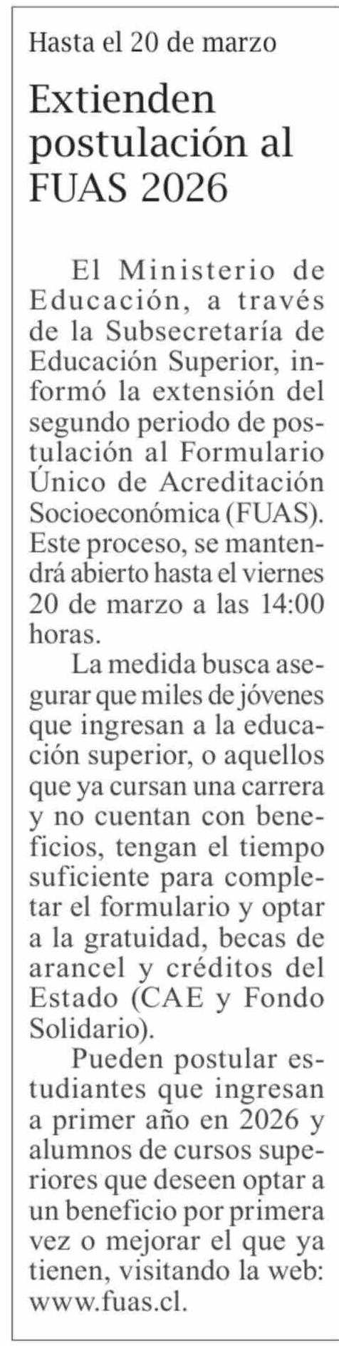 Título: Extienden postulación al FUAS 2026