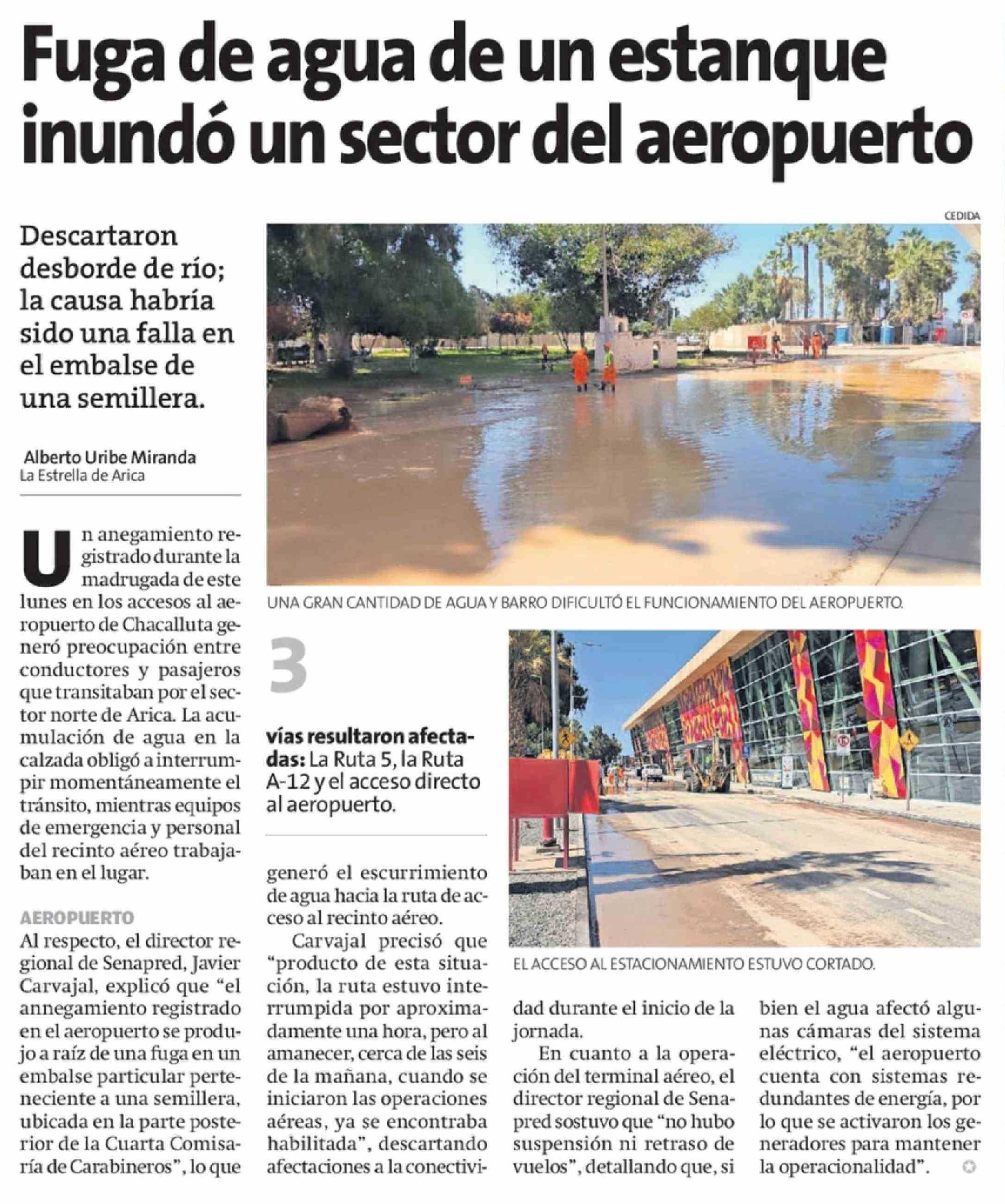 Fuga de agua de un estanque inundó un sector del aeropuerto 10-02-2026 La Estrella de Arica |